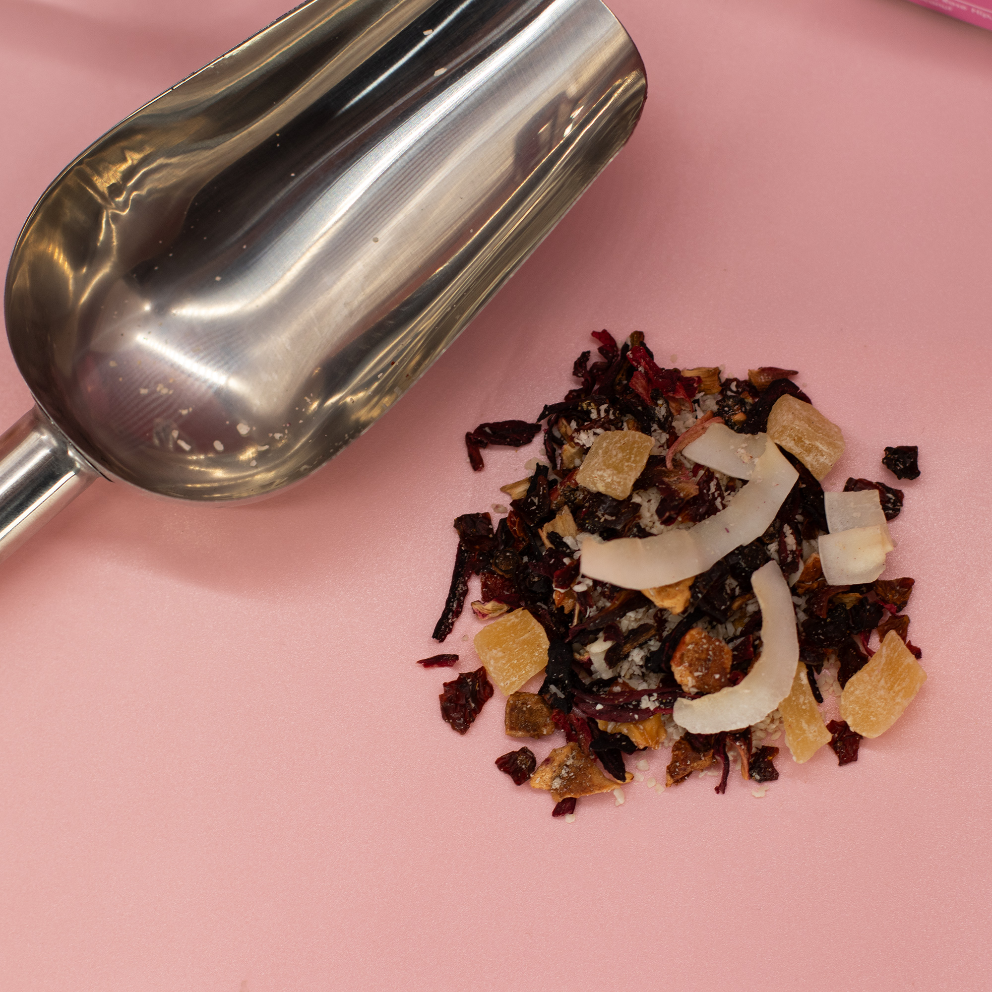 Pineapple pieces (30%) [pineapple, cane sugar, citric acid (E330)], cut hibiscus flowers, rose hips, apple pieces (9.0%), salt, citric acid (E330), optional ascorbic acid (E300)], grated coconut (13.0%), coconut chips (6.0%), natural flavouring