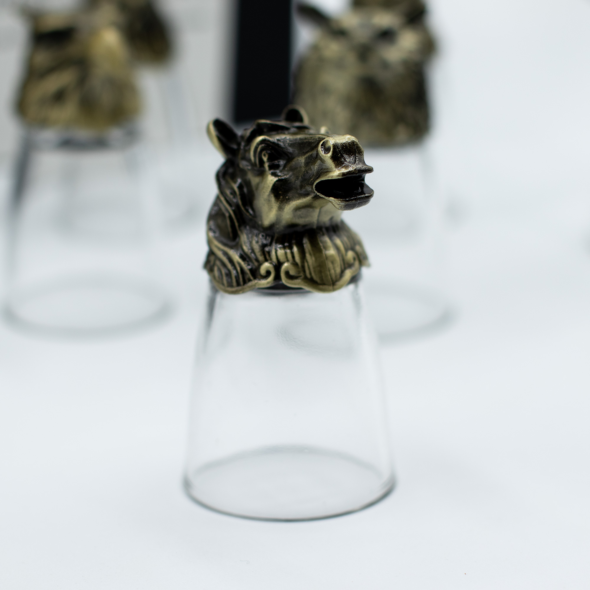 Mindegyik 25 ml-es pohár kézzel készült átlátszó üvegből, tömör sárgaréz talppal, részletes állat- vagy mitikus mintákkal kidolgozva.
