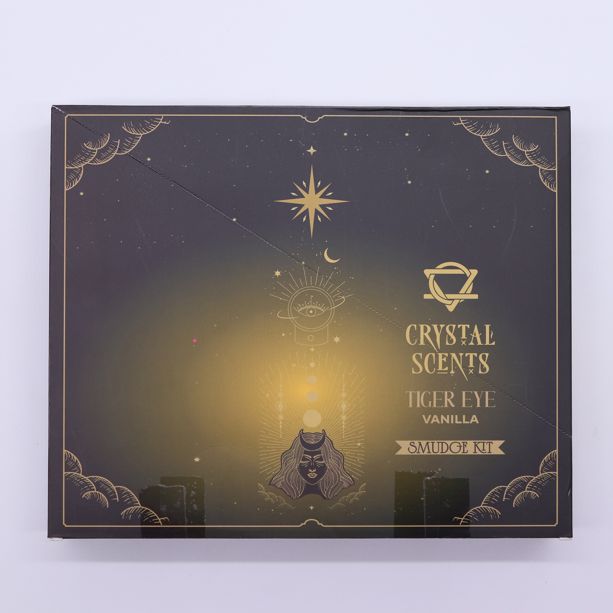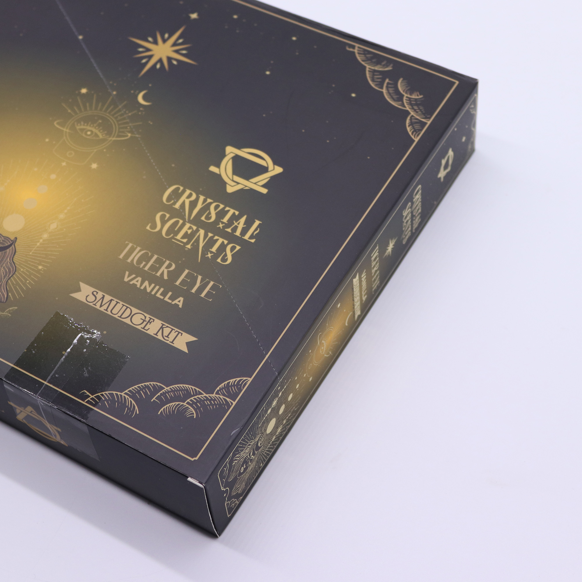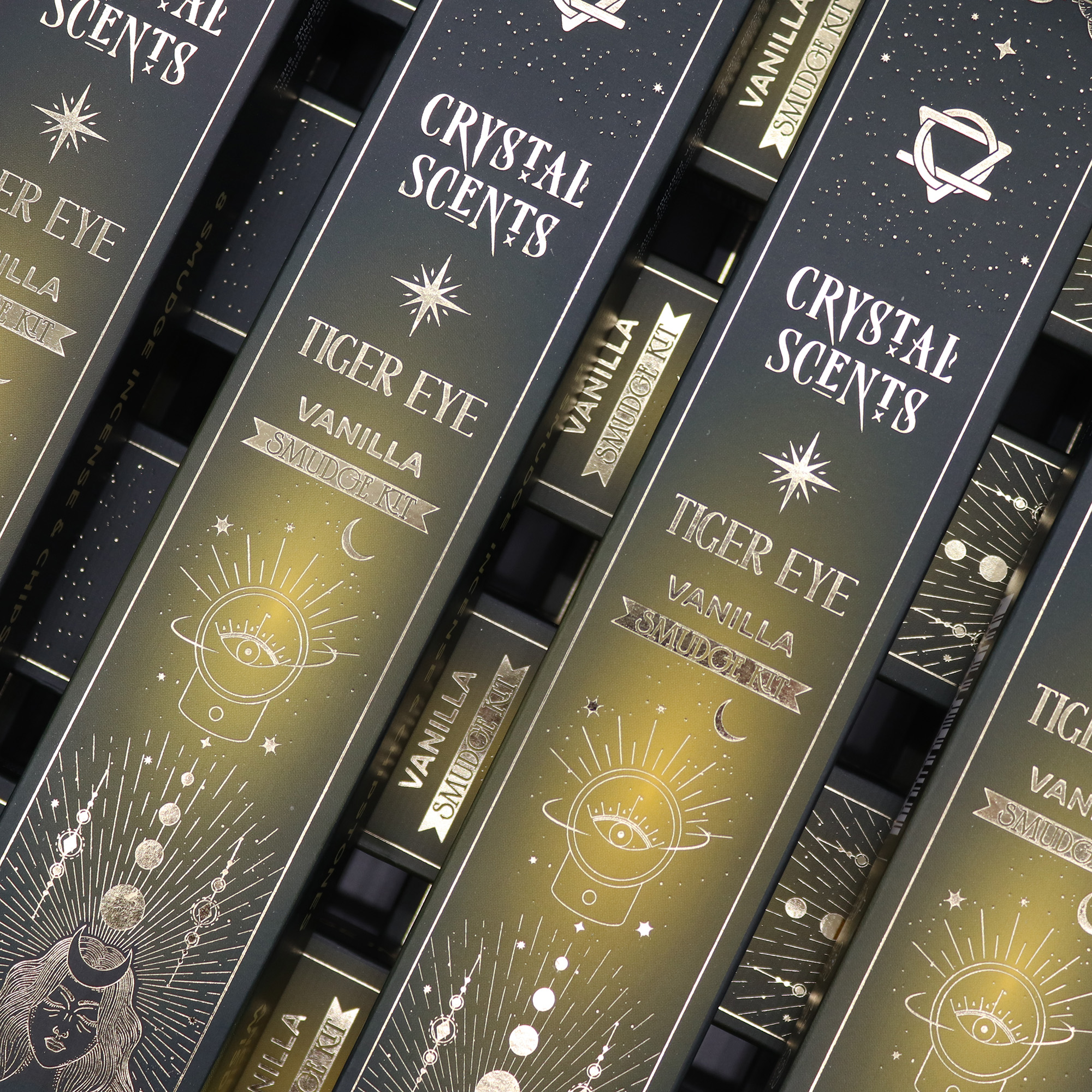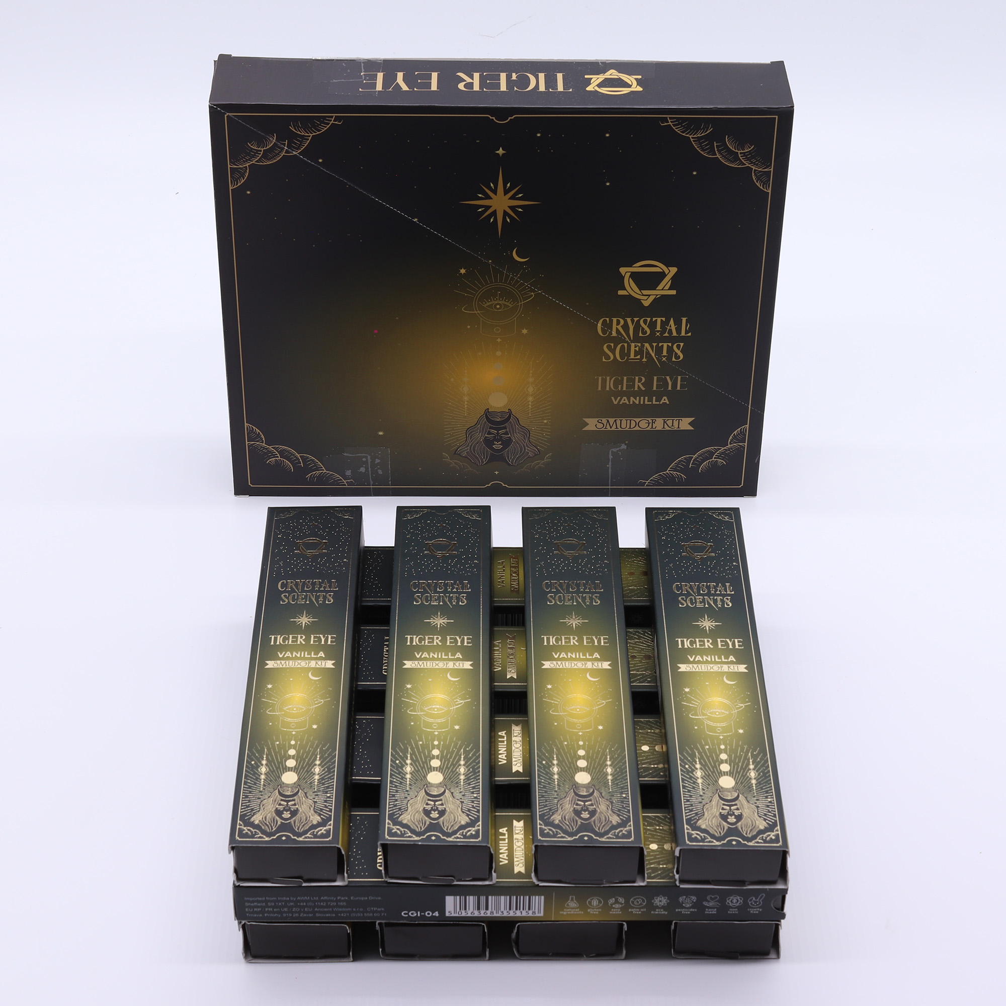 A 12 darabos Tigrisszem Kristály Füstölő a vanília lágyan édes illatát párosítja egy különleges, arany tónusú csomagolással. A doboz grafikai megoldásai a mély arany és fekete kombinációjára épülnek, így elegáns, rendezett megjelenést kínál, amely bármely üzlet polcán könnyen magára vonja a figyelmet.