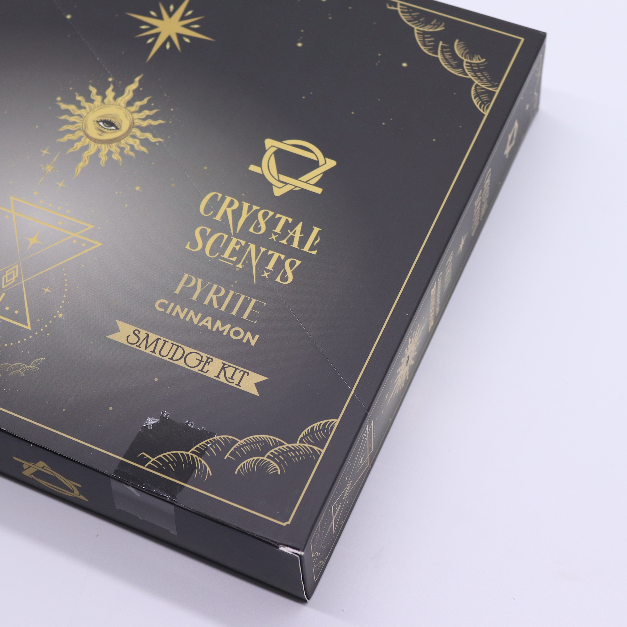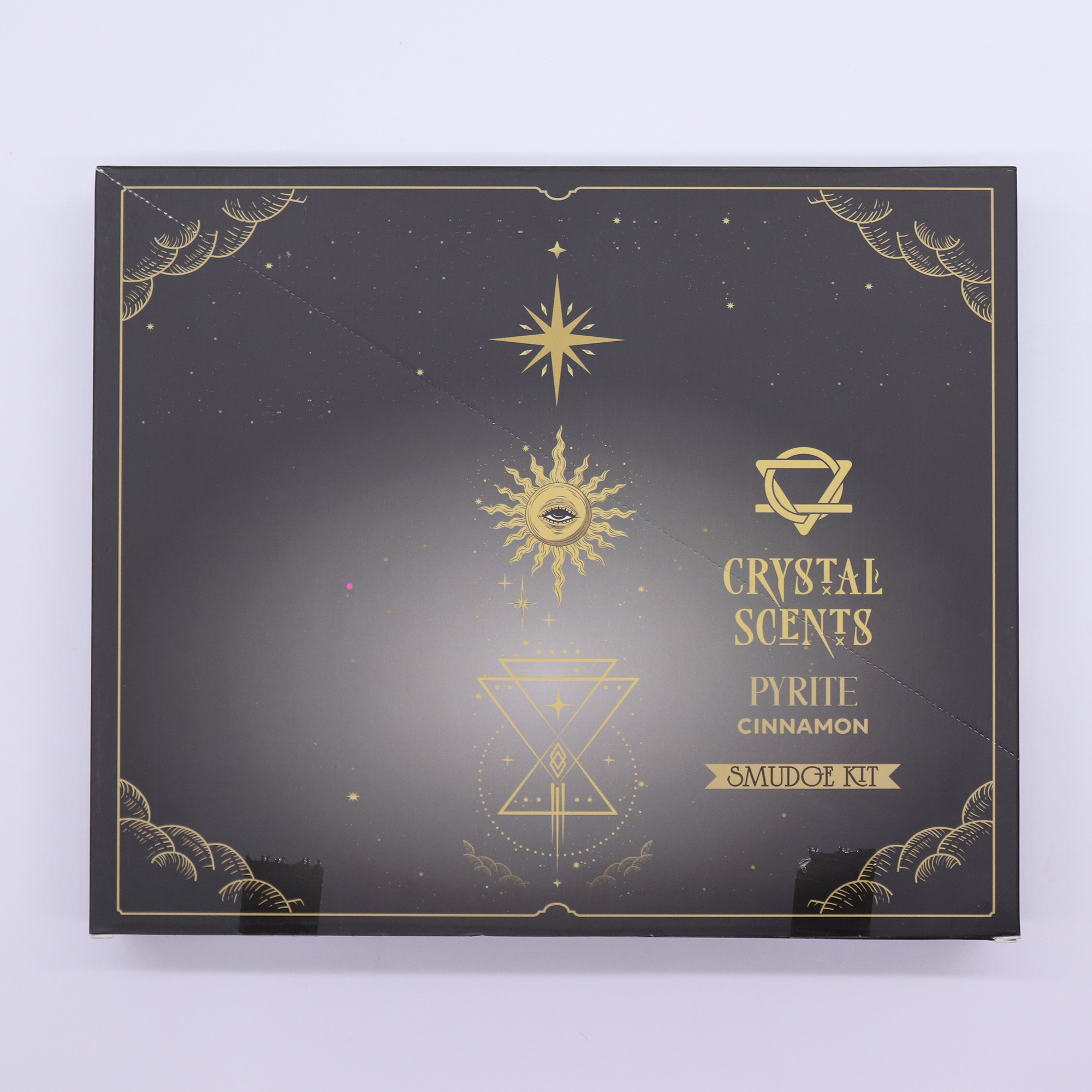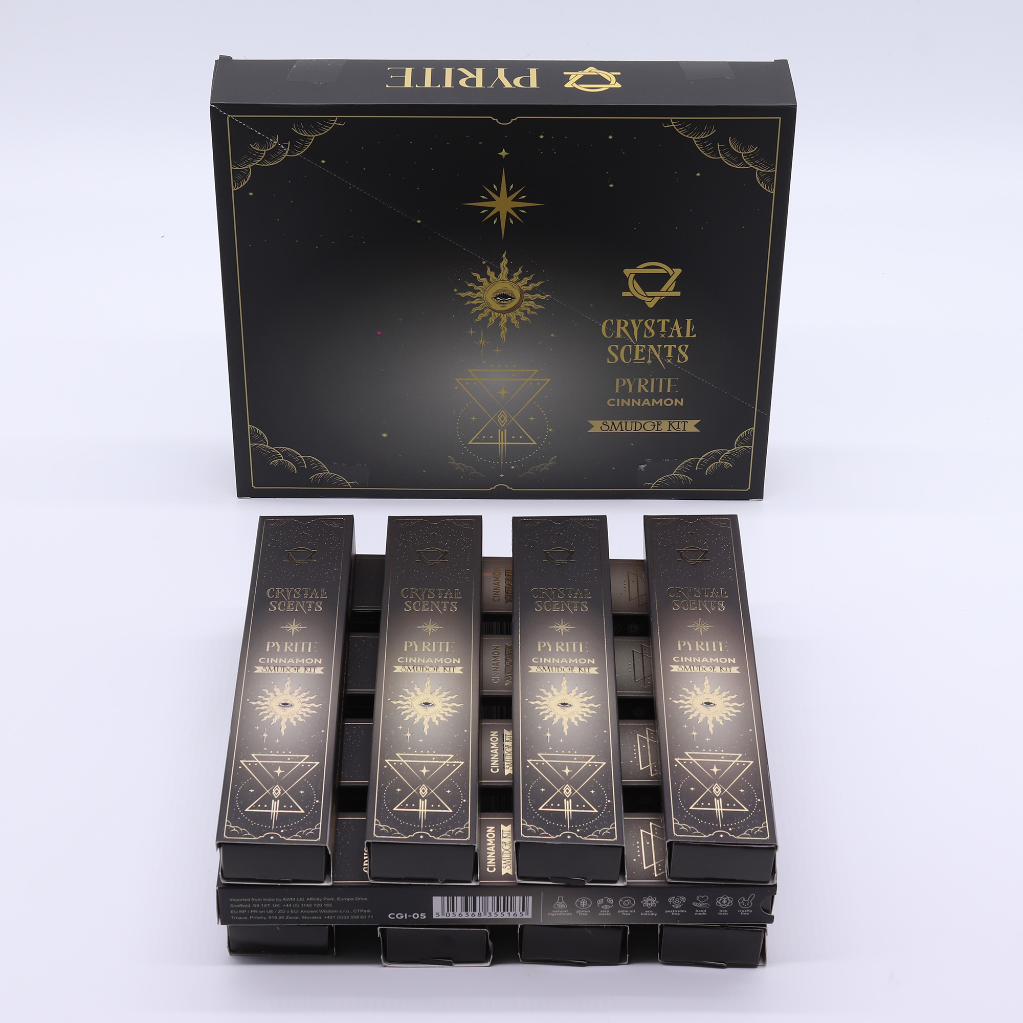 A 12 darabos Pirit Kristály Füstölő a fahéj jellegzetesen meleg, fűszeres illatát kapcsolja össze egy elegáns, sötétszürke–arany tónusú csomagolással. A doboz grafikai elemei letisztultak és modern hatást keltenek, így a termék rendezett, igényes megjelenést biztosít az üzlet polcain.
