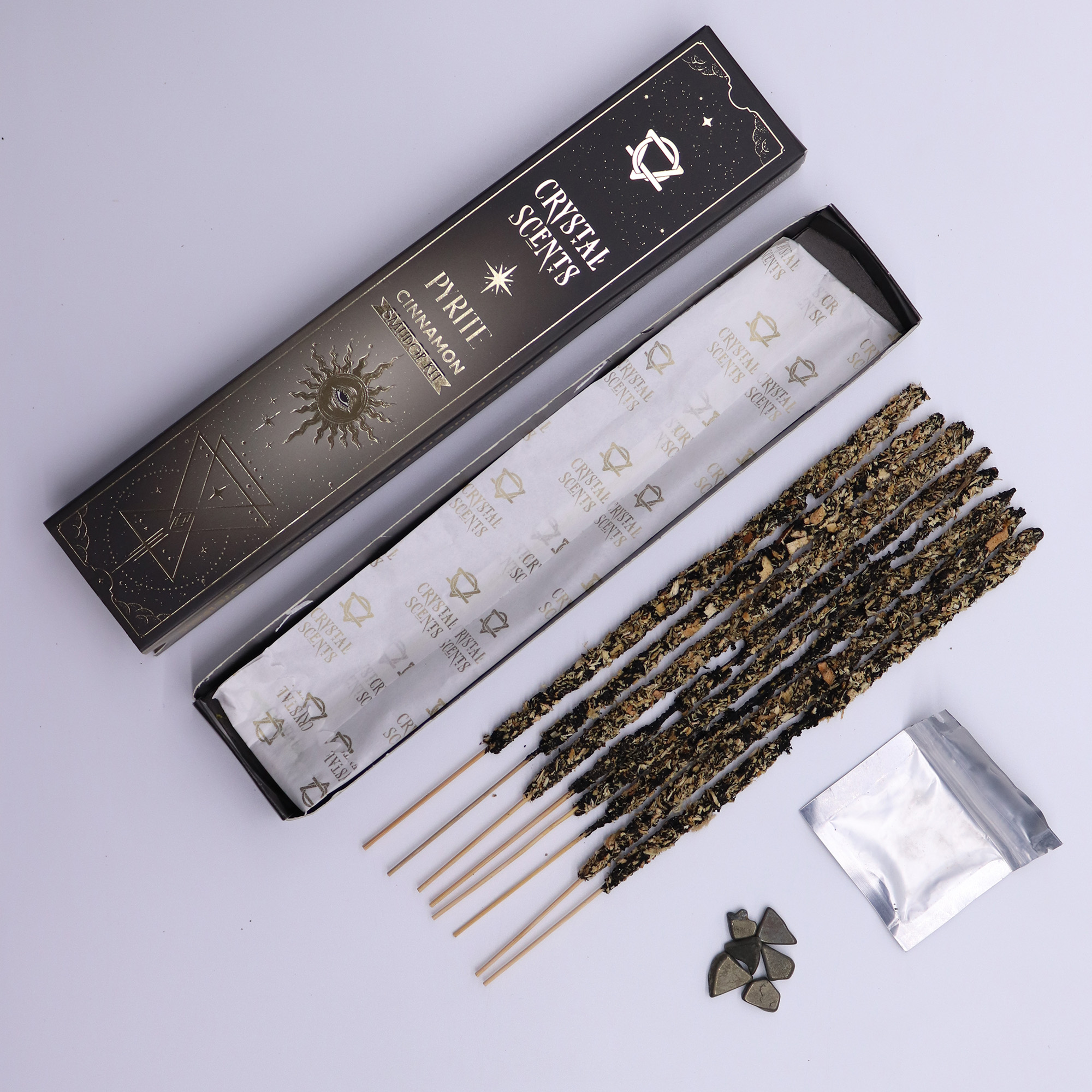A belső elrendezésben gondosan sodort füstölők kaptak helyet, egymás mellett sorban elhelyezve. A csomag részeként apró piritkövek is találhatók, amelyek tovább gazdagítják a vizuális összhatást. A fahéj illata meleg, otthonos hangulatot teremt, és jól használható a mindennapokban, különösen az őszi és téli hónapok során.