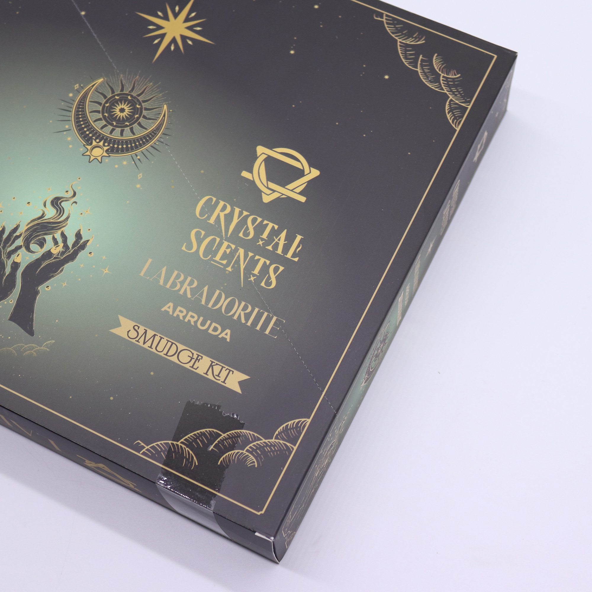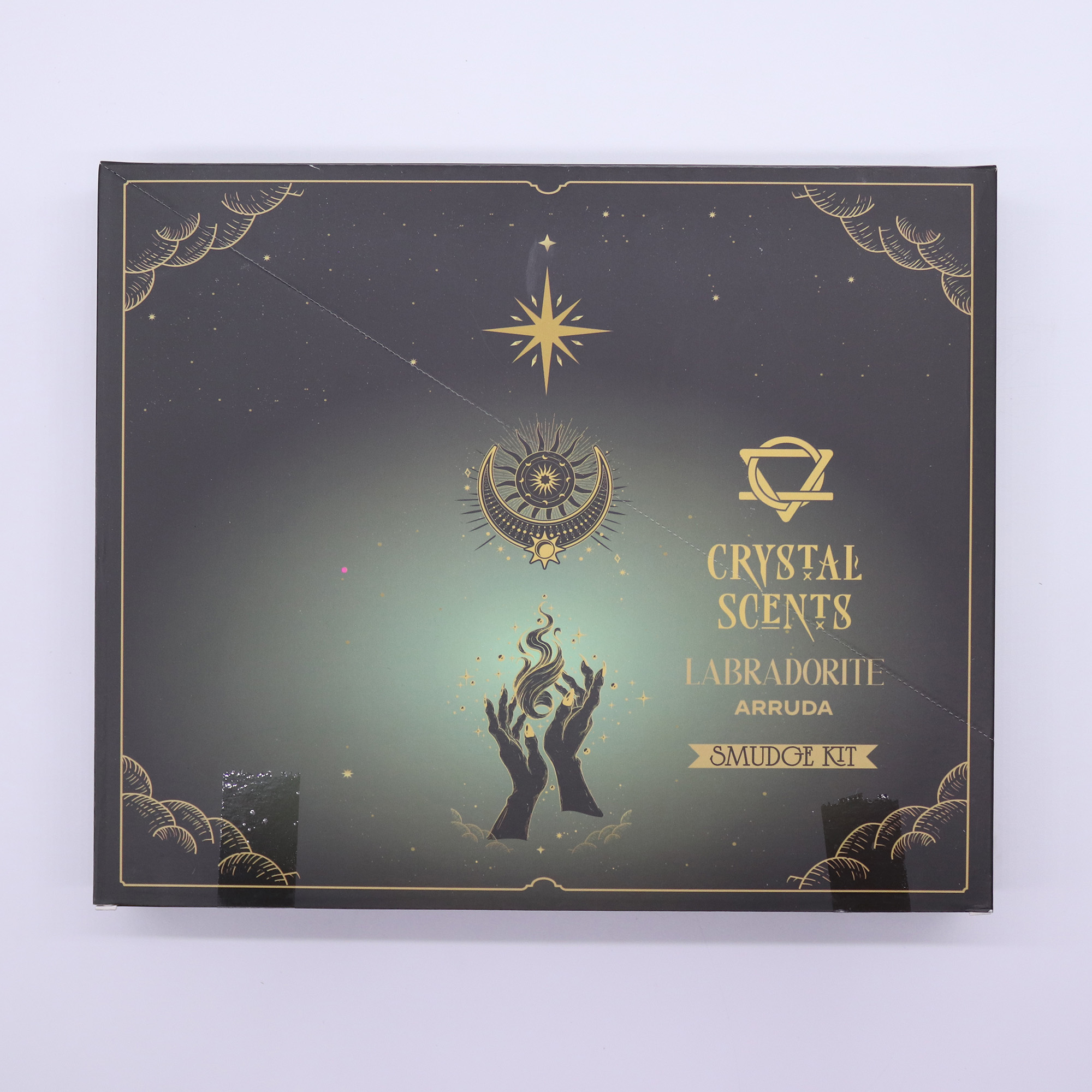 A 12 darabos Labradorit Kristály Füstölő az arruda karakteres, friss illatát társítja egy elegáns, zöldesszürke tónusú csomagolással. A doboz modern arany grafikai elemekkel egészül ki, amelyek rendezett, letisztult megjelenést biztosítanak, így a termék könnyen beilleszthető bármilyen illatosító vagy ajándék kategóriába.