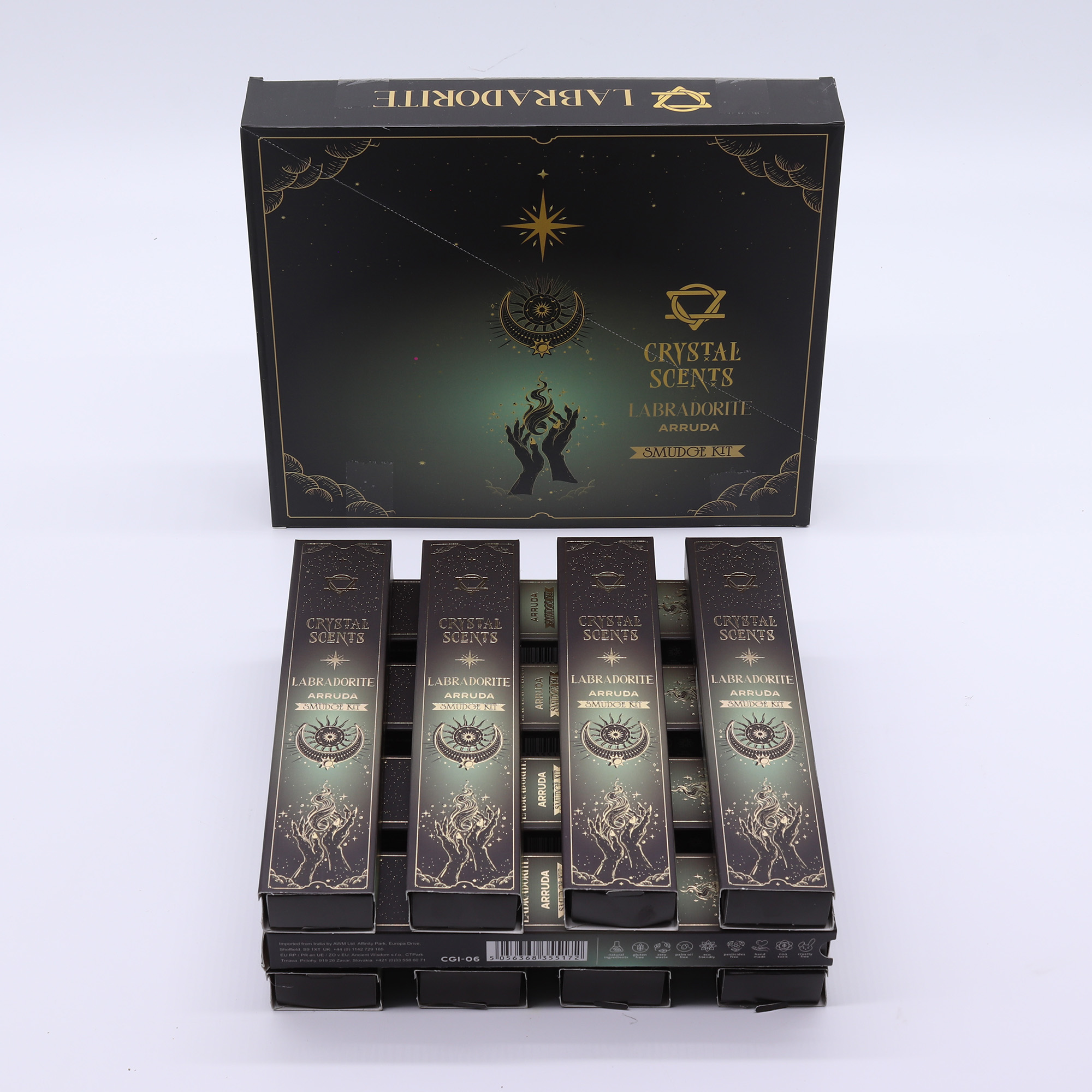 A csomagolás belsejében precízen sodort füstölők kaptak helyet, egymás mellett, jól áttekinthetően. A szett részeként apró labradorit kövek is megtalálhatók, amelyek vizuálisan erősítik a termék egységes hangulatát. Az arruda illata friss és tiszta, így ideális a lakótér felfrissítésére vagy a mindennapi használathoz.