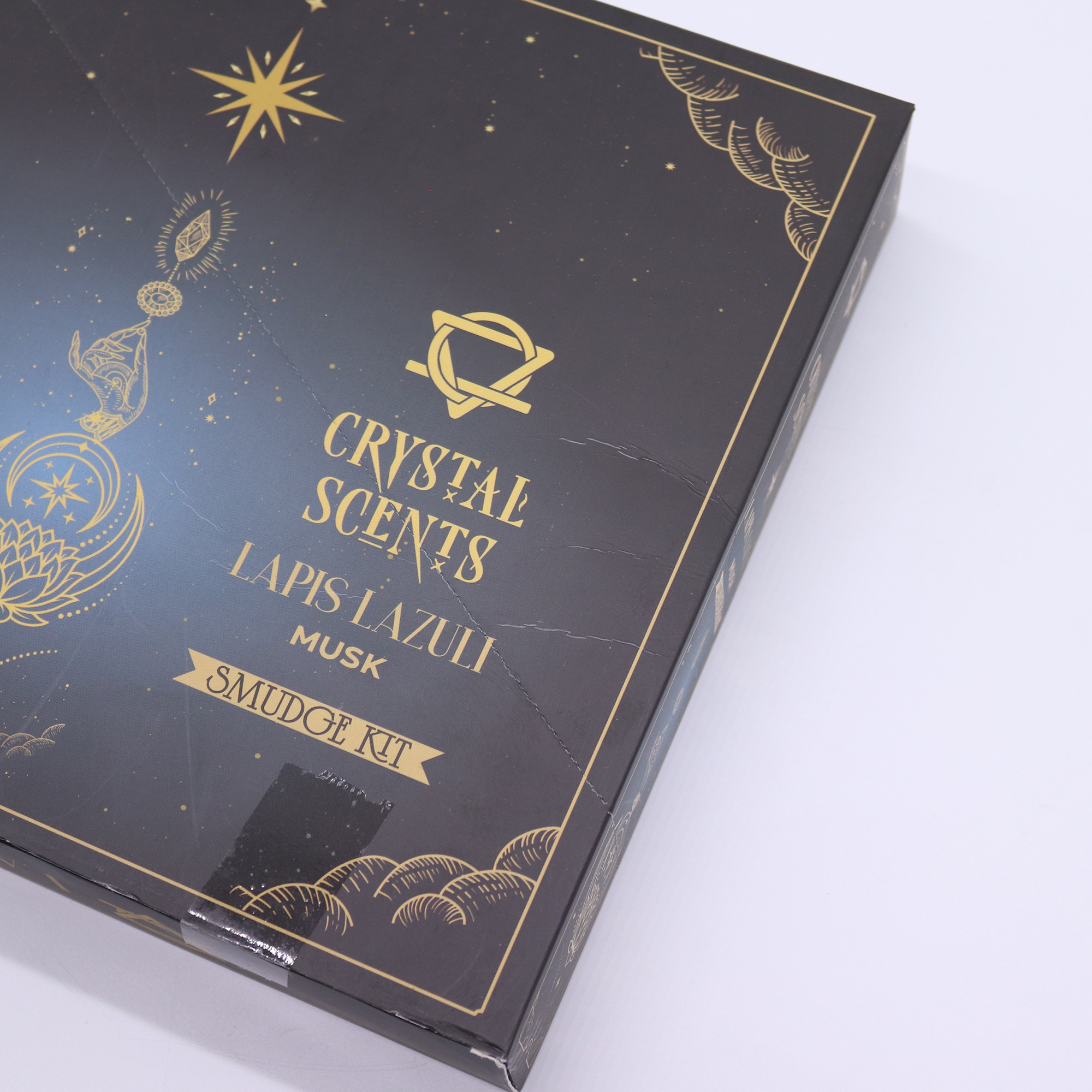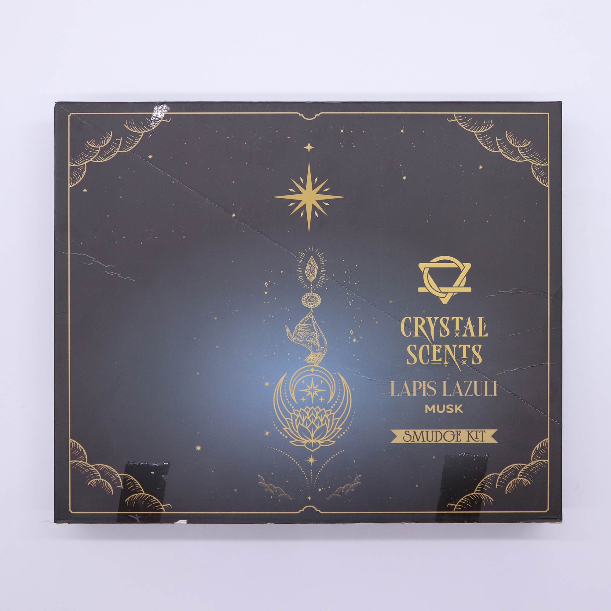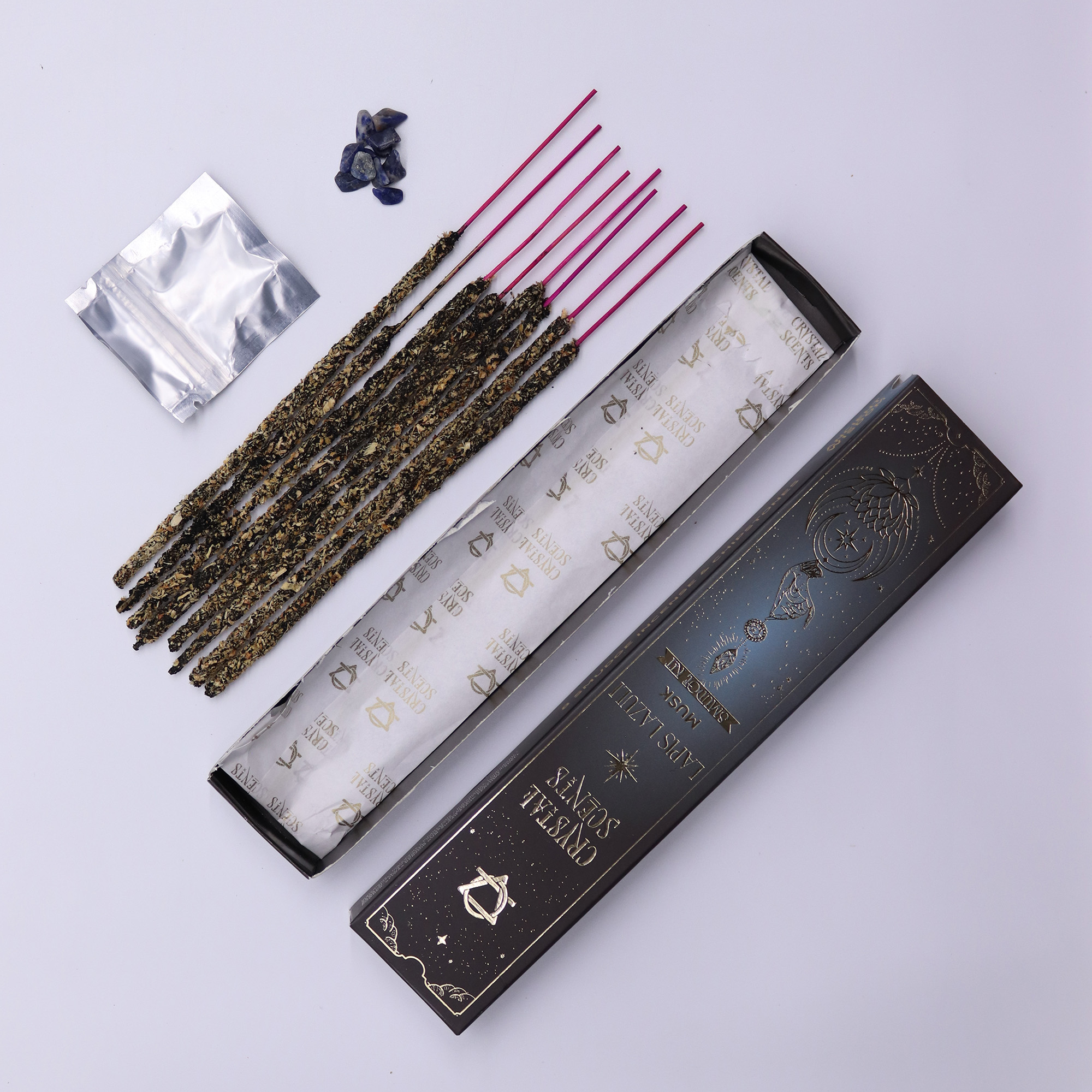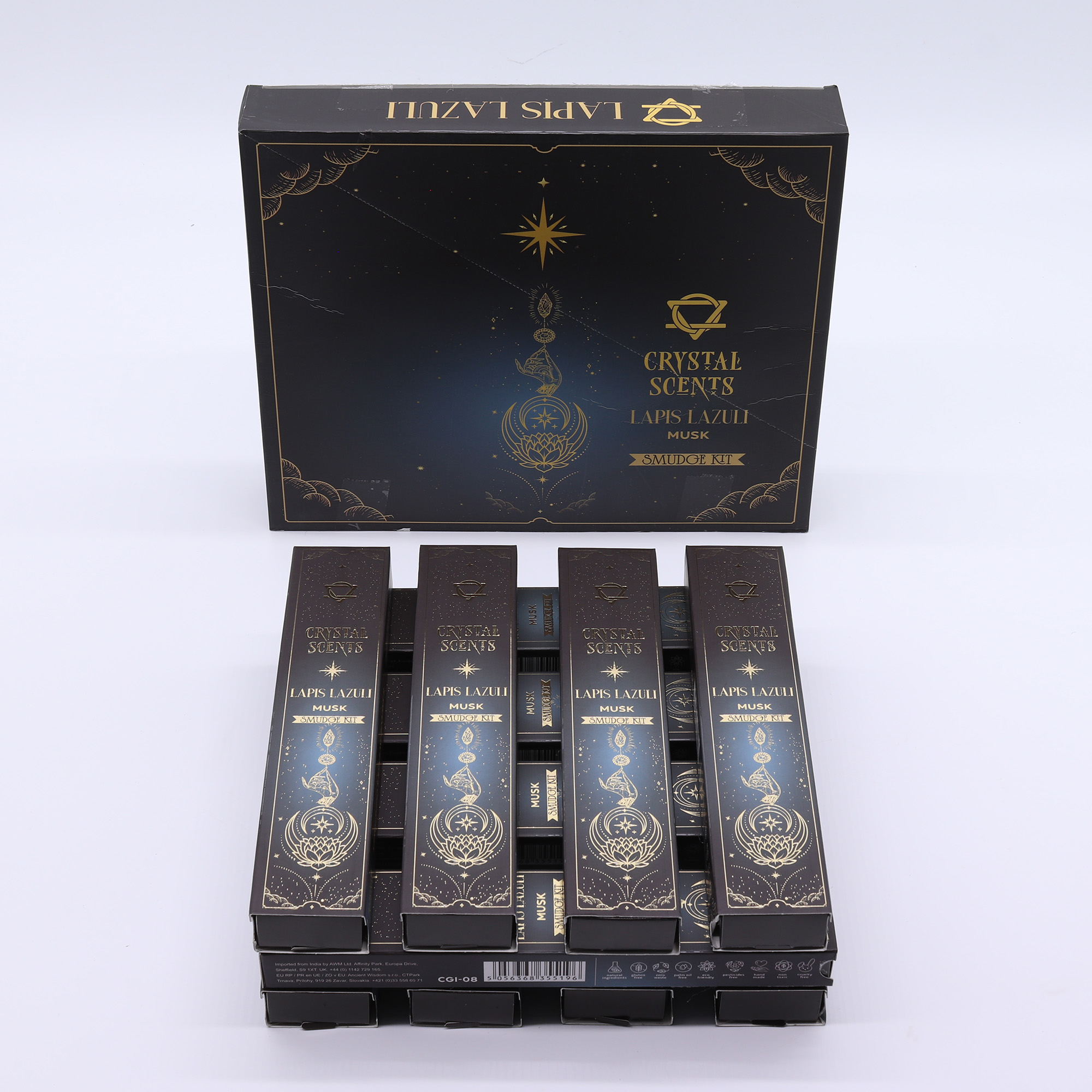 A doboz belsejében sorban elhelyezett, gondosan sodort füstölők találhatók. A csomag részét képezik a kis lapis lazuli kövek is, amelyek vizuálisan egységessé teszik a terméket, és harmonikusan illeszkednek a csomagolás színvilágához. A musk illata meleg, finoman karakteres, amely kellemes, nyugodt légkört teremt a lakótérben.