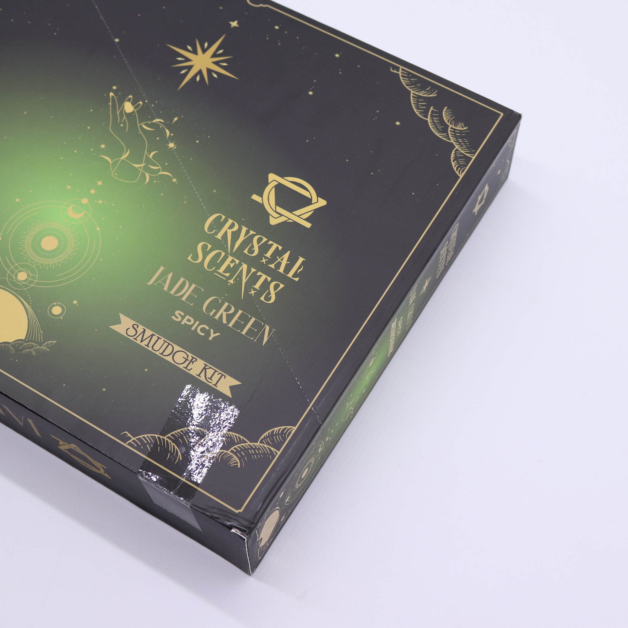 A csomagolás belsejében gondosan sodort füstölők sorakoznak, áttekinthetően elrendezve. A szett részeként néhány jade kő is helyet kapott, amelyek vizuálisan kiegészítik a termék jellegét, és harmonikusan illeszkednek a zöld színvilághoz. A fűszer illata meleg és markáns, amely kellemes hangulatot teremt nappaliban, dolgozószobában vagy más otthoni terekben.