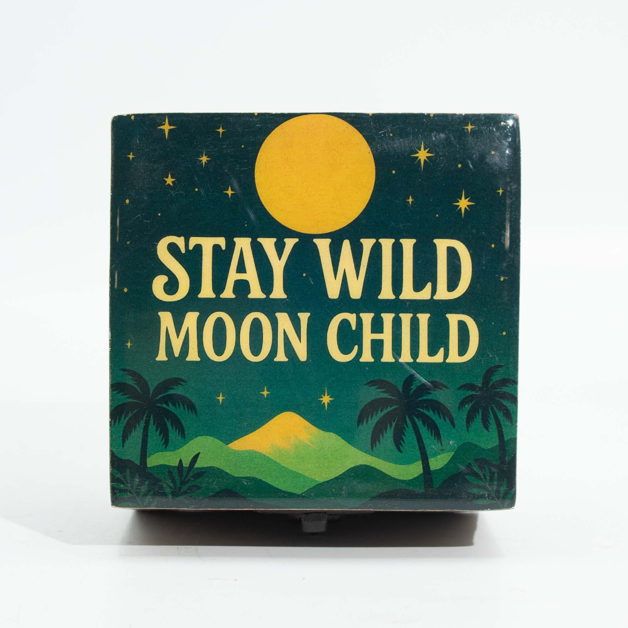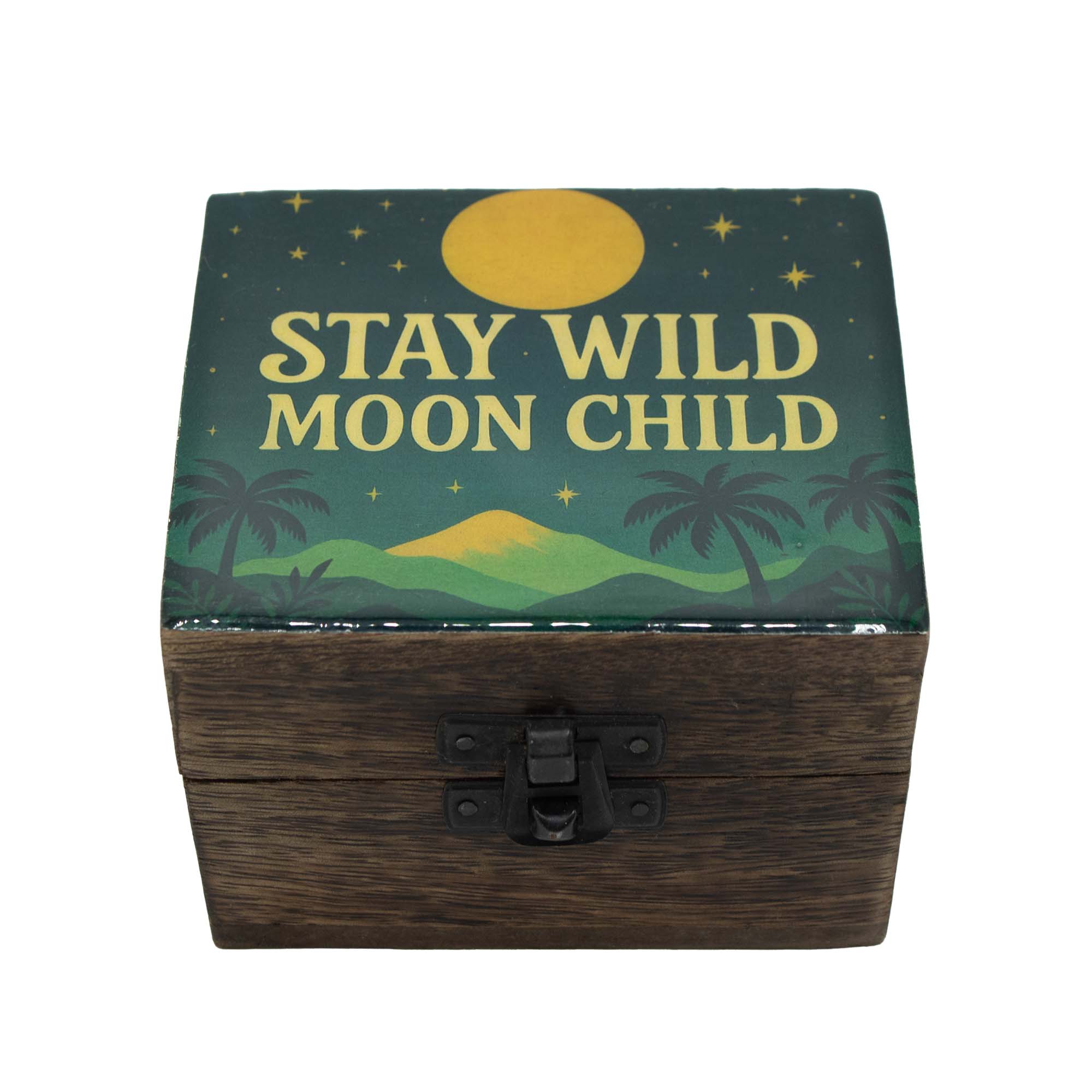Ez a kisméretű, színes bevonatú fa doboz vidám hangulatával és Stay Wild Moon Child feliratával dekoratív és praktikus kiegészítő. Felnyitható kialakítása ideális apró tárgyak, ékszerek vagy személyes emlékek tárolására. Kompakt méretének köszönhetően könnyen elhelyezhető polcon, íróasztalon vagy éjjeliszekrényen. Egyedi megjelenése miatt ajándéknak is kiváló választás.