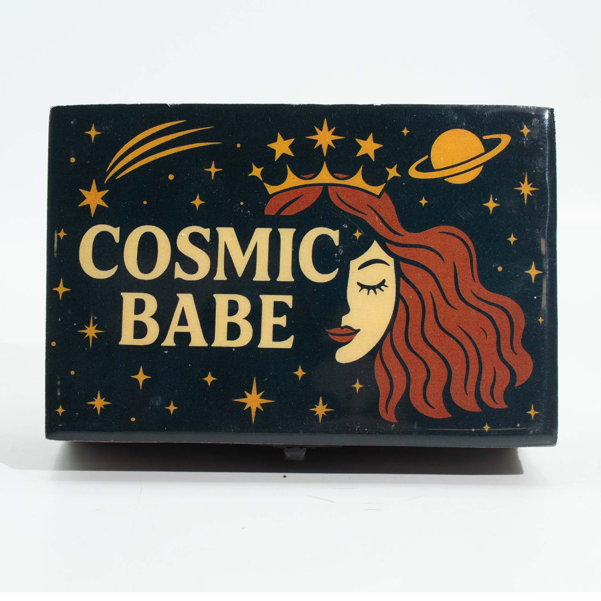 Ez a közepes méretű, színes bevonatú fa doboz merész grafikájával és Cosmic Babe feliratával igazán karakteres darab. Felnyitható kialakítása ideális ékszerek, apró tárgyak vagy személyes emlékek tárolására. Praktikus méretének és látványos megjelenésének köszönhetően jól mutat polcon vagy komódon, ajándéknak is remek választás.