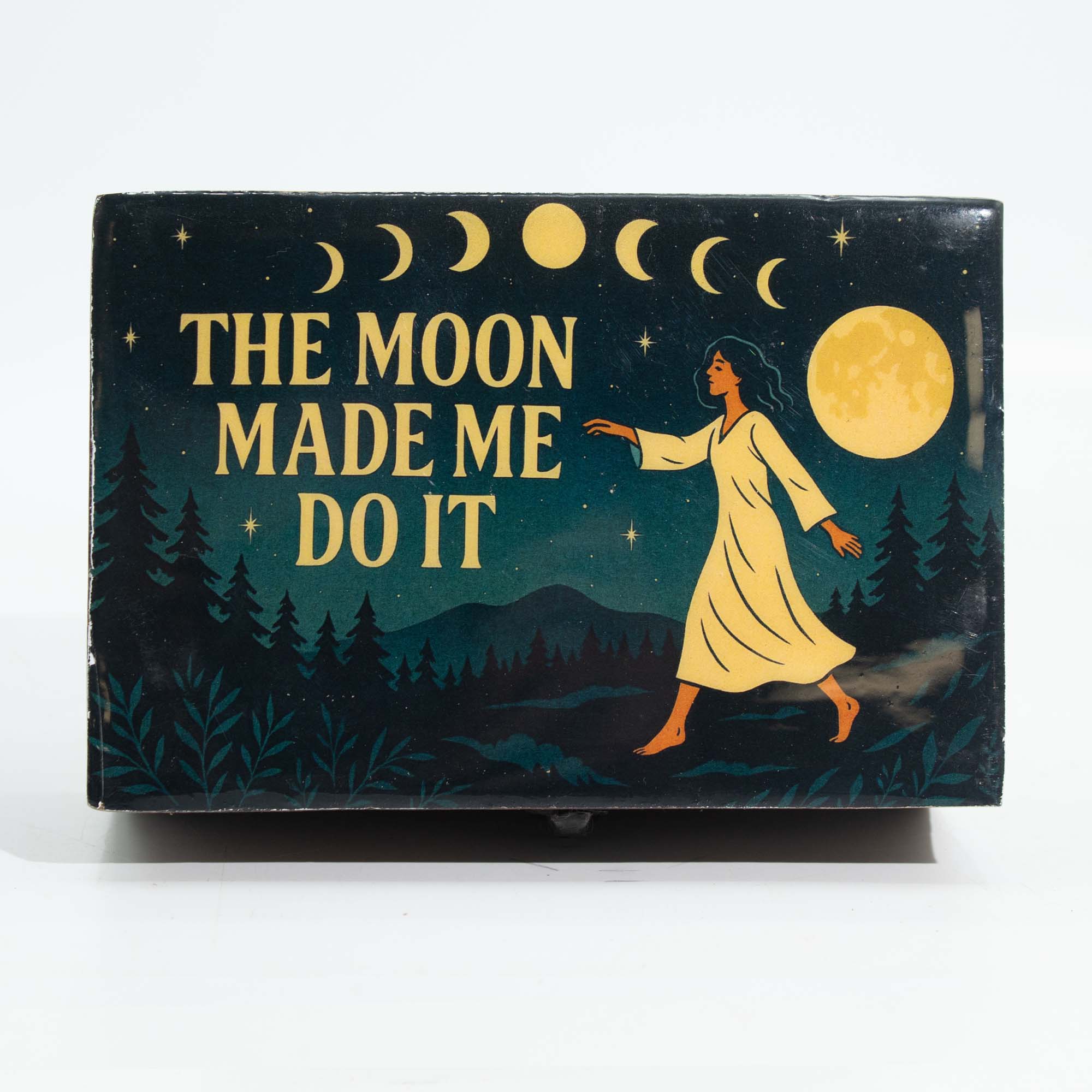 Ez a közepes méretű, színes bevonatú fa doboz hangulatos illusztrációjával és The Moon Made Me Do It feliratával játékos, kissé titokzatos megjelenést kínál. Felnyitható kialakítása ideális ékszerek, apró tárgyak vagy személyes emlékek tárolására. Méretének köszönhetően jól mutat polcon vagy komódon, dekoratív stílusa miatt ajándéknak is remek választás.