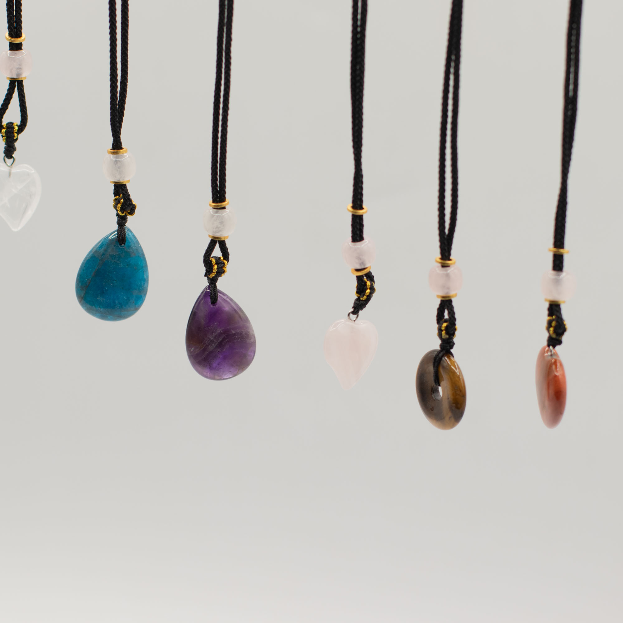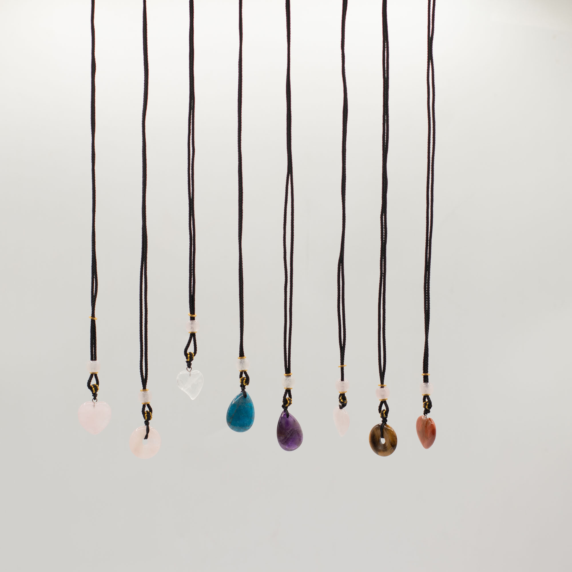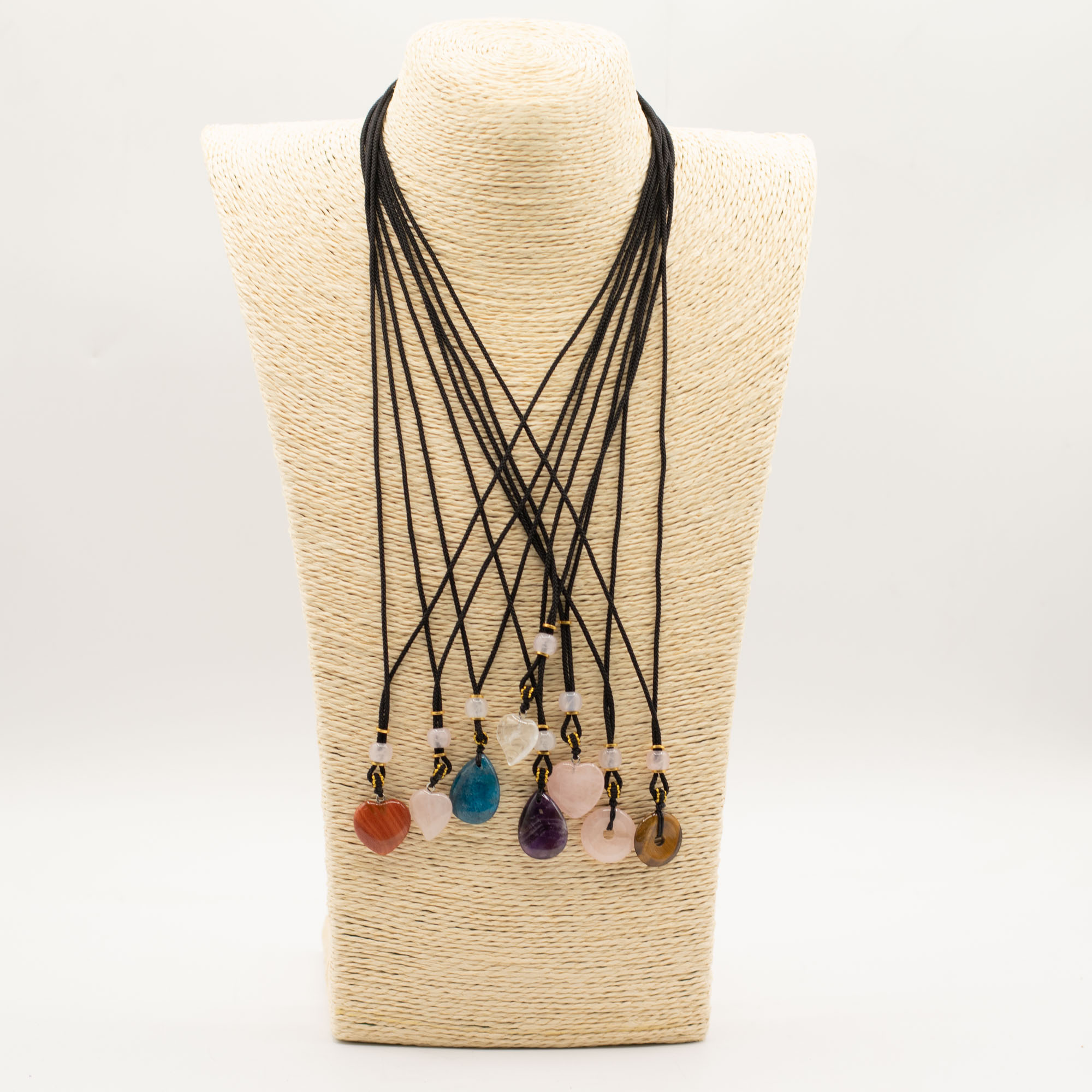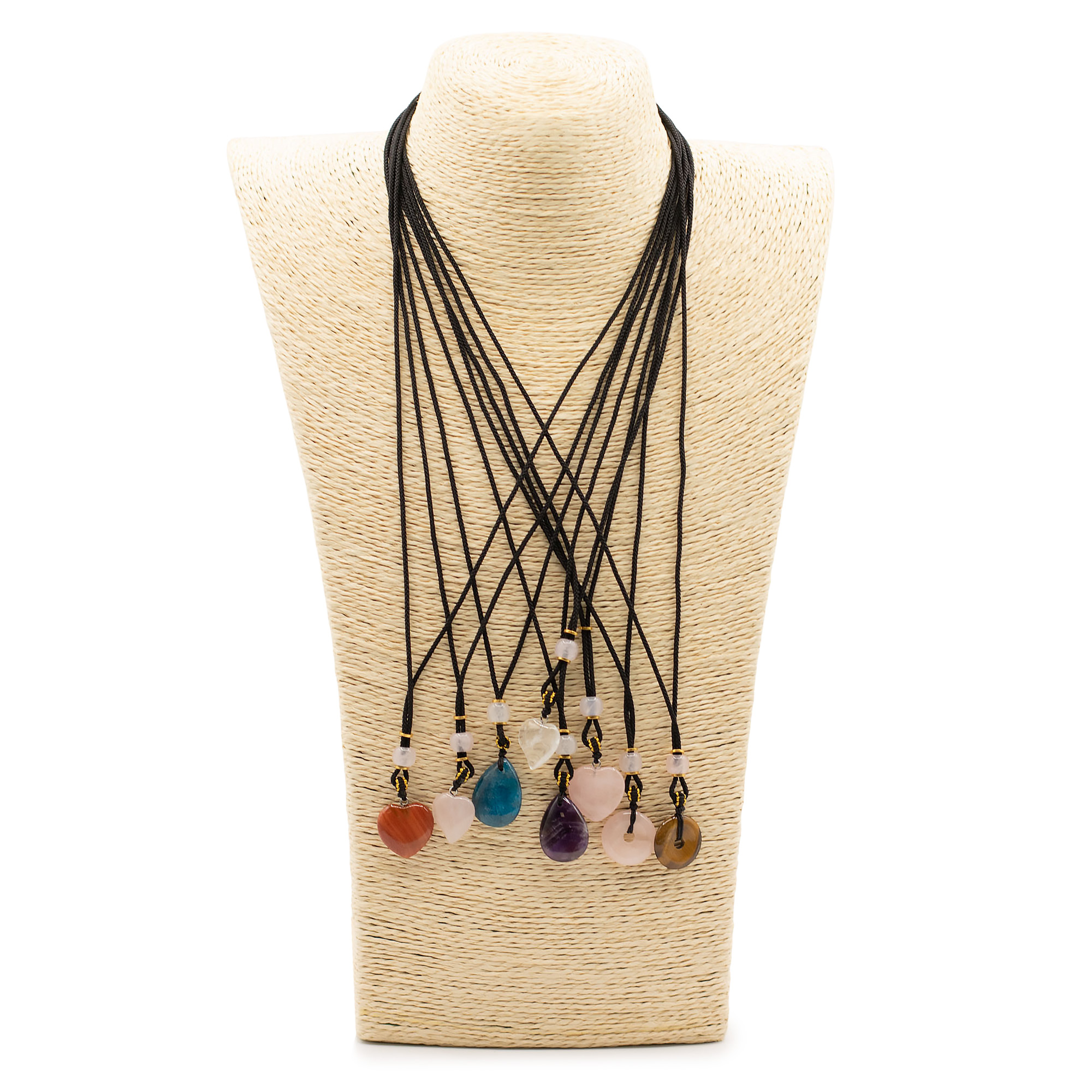 Ez a 8 darabos, vegyes összeállítású zsinóros nyaklánc csomag szív formájú ásvány medálokat tartalmaz. A különböző színek és kőfajták változatos, könnyen értékesíthető kínálatot biztosítanak.