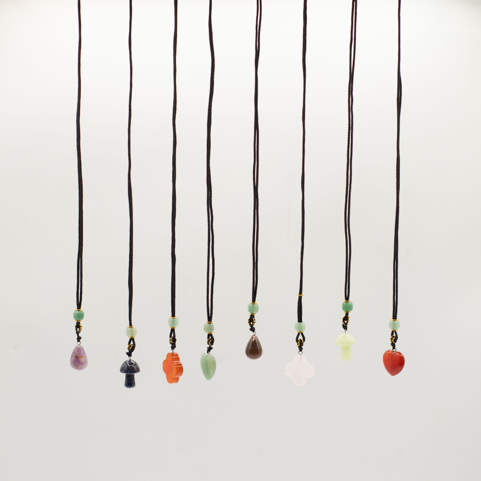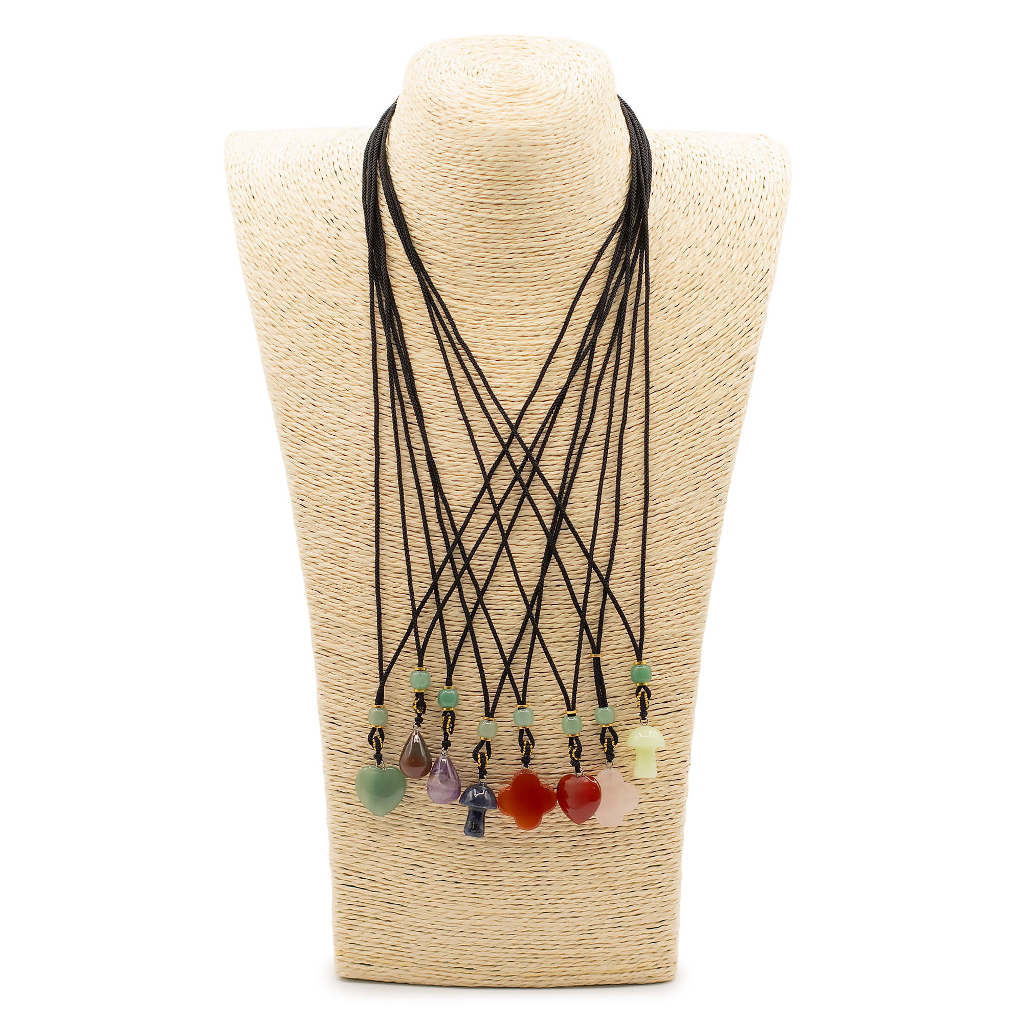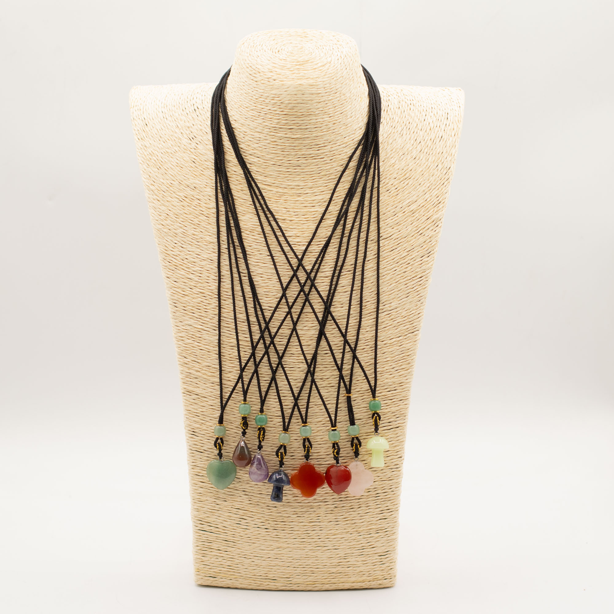 Ez a 8 darabos, vegyes összeállítású zsinóros nyaklánc csomag növényi motívumú ásvány medálokat tartalmaz. A különböző formák és színek változatos, könnyen kombinálható kínálatot biztosítanak.