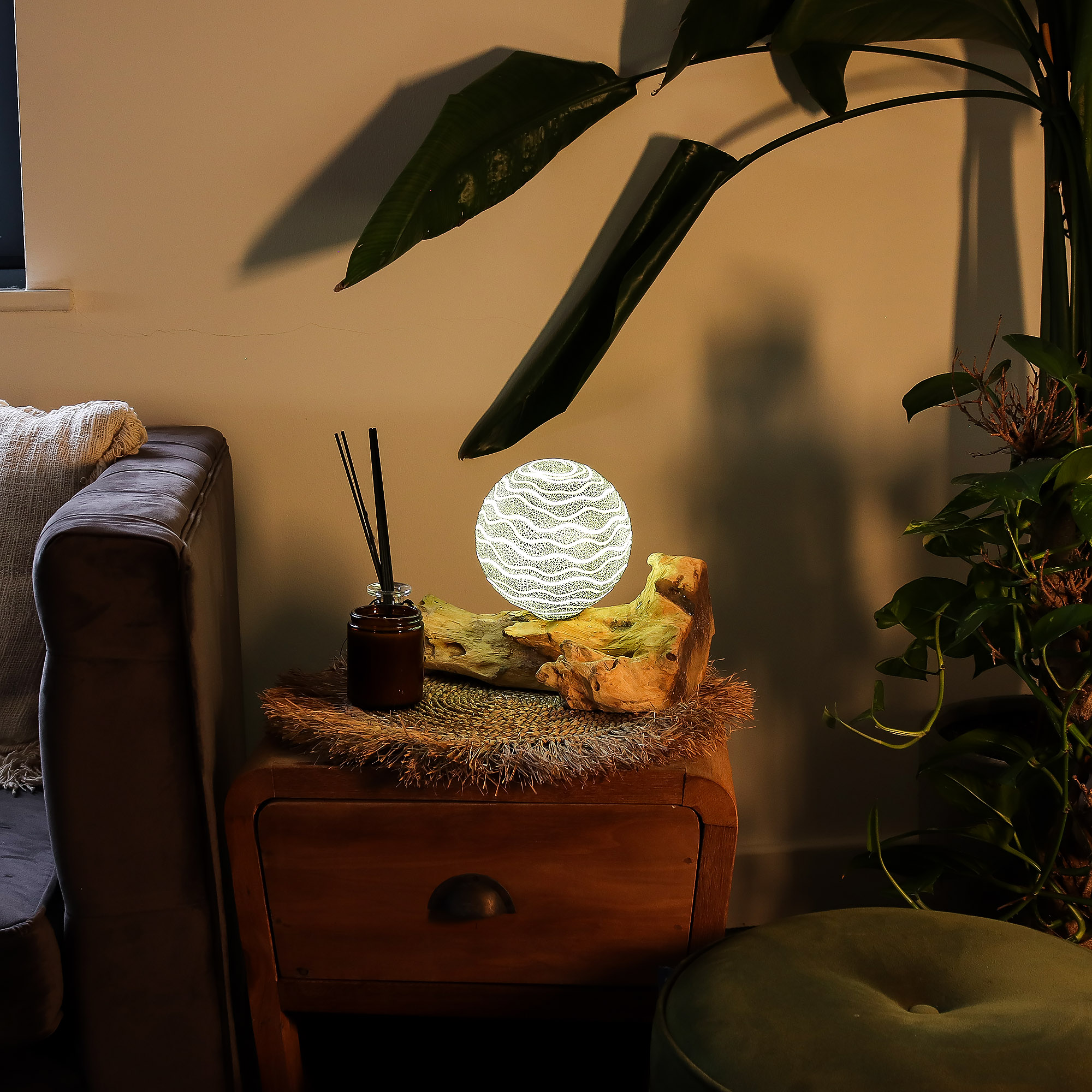 A Drift Glow Szürke Gömb lámpa a természetes uszadékfa és a modern hangulatvilágítás találkozásából született. Olyan dekorációs darab, amely egyszerre különleges és visszafogott, így könnyen beilleszthető bármely otthon stílusába. A lámpa alapja egy egyedileg formált uszadékfa darab, amelynek organikus alakja és természetes mintázata minden lámpát egyedivé tesz. Erre kerül a szürke, hullámvonalas mintázatú gömbbúra, amely lágy fényével megnyugtató, otthonos atmoszférát teremt.