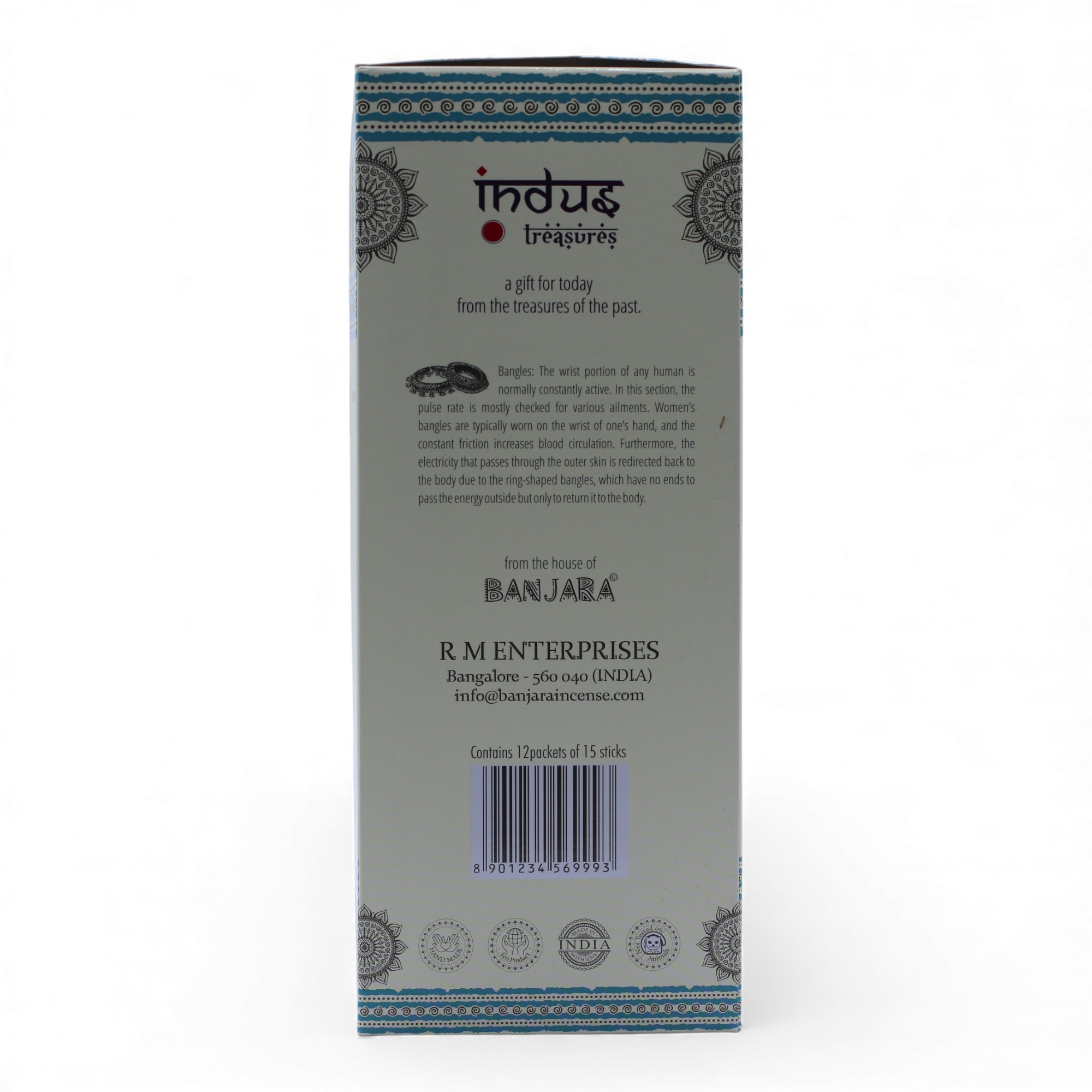 A doboz elegáns indiai mintákkal díszített, prémium megjelenésű. A füstölők belül Banjara papírba csomagolva találhatók, ami igényes, ajándékozásra is alkalmas összhatást biztosít.