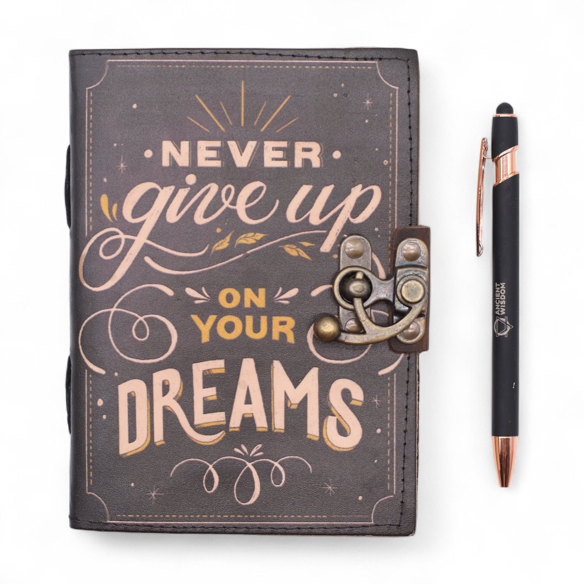 A "Never Give Up On Your Dreams" - "Sose Add Fel az Álmaidat" nyomott bőrkötésű napló motiváló üzenetével és igényes kivitelezésével inspiráló társ a mindennapokra. A borítón aranyos árnyalatú, nyomott felirat és egy antik stílusú fémzár található, amely elegáns megjelenést és praktikus használatot biztosít.