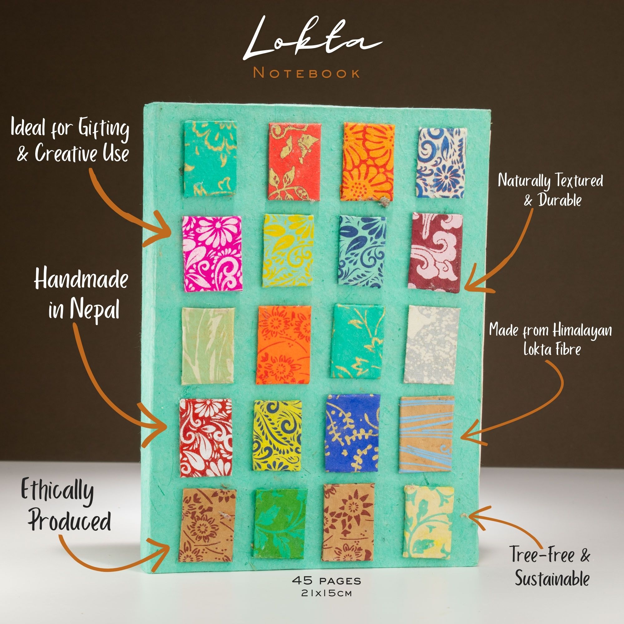 A Nagy Türkiz Lokta Papír Napló friss, élénk színvilágával és játékos mintázatával azonnal magára vonja a figyelmet. A különböző dekoratív motívumok rendezett elrendezése modern, mégis kézműves hatást kelt. Nepálban, hagyományos technikával készült lokta papírból, amely természetes textúrájával és egyedi karakterével valódi inspirációt nyújt. Ideális választás azoknak a vásárlóknak, akik szeretik a színes, pozitív energiát sugárzó írószereket.