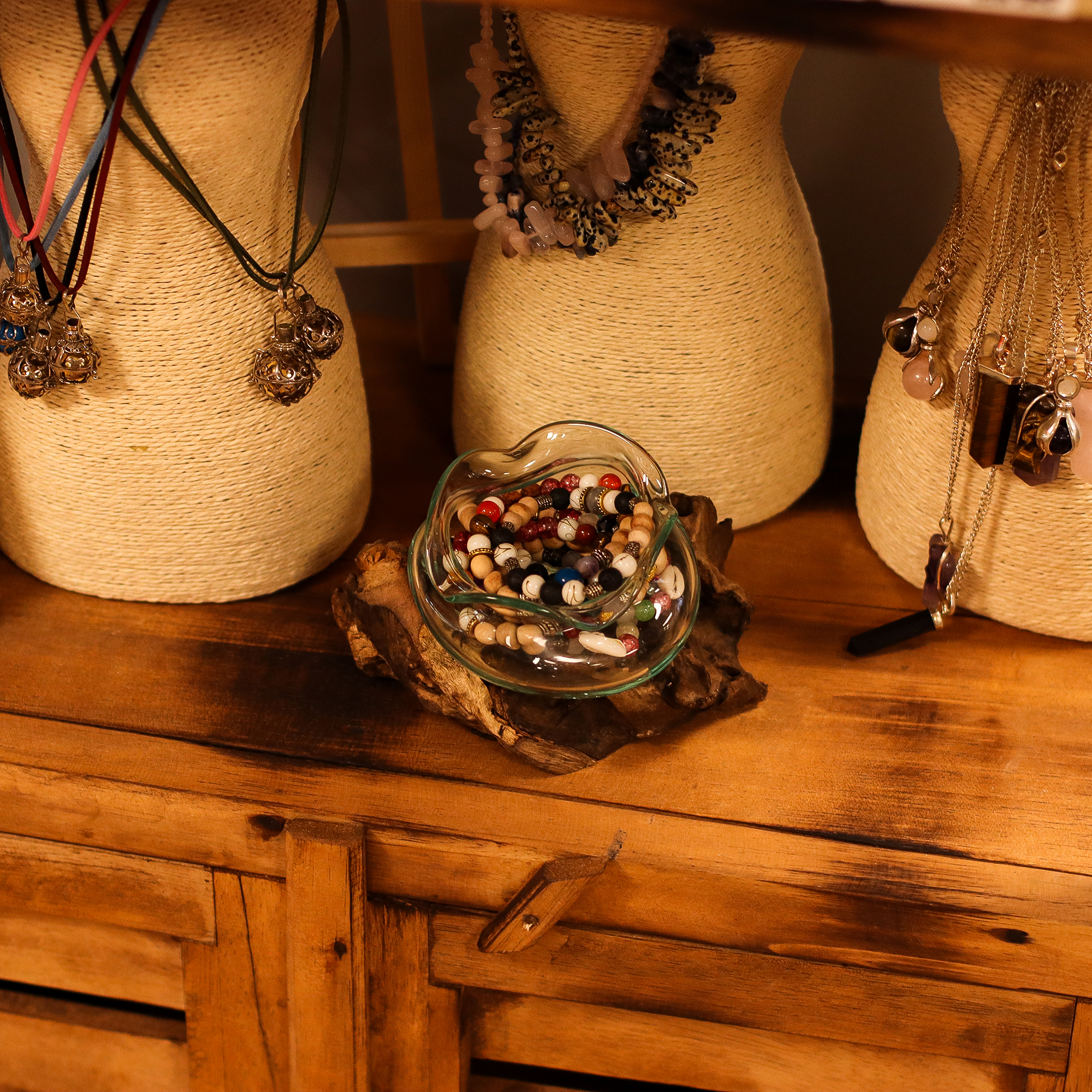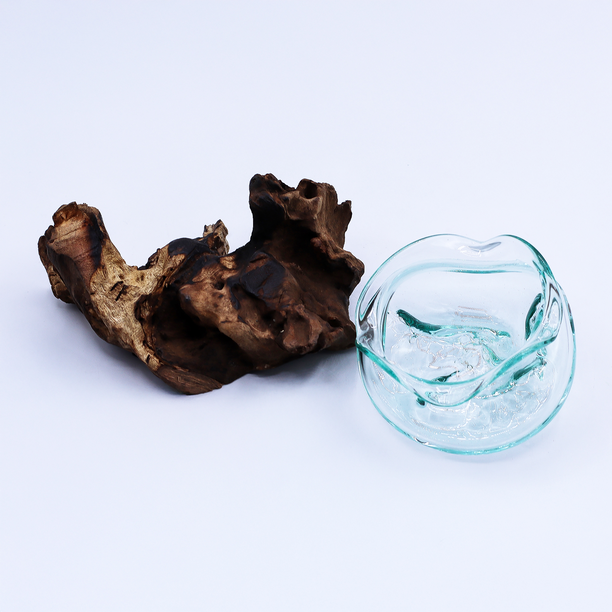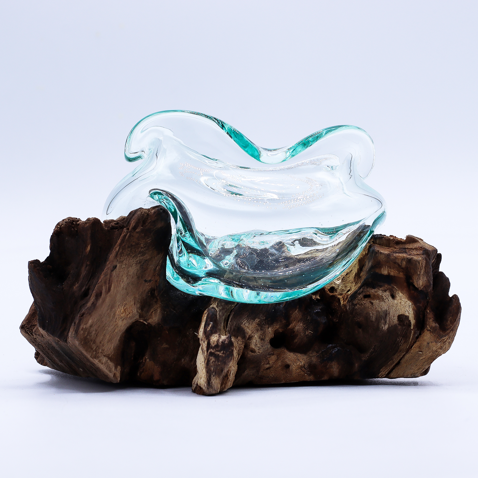 Az olvadt üveg közvetlenül a fára van formázva, elegáns hullámokat és organikus íveket hozva létre, amelyek tökéletesen illeszkednek az alaphoz. Szoborszerű kialakítása sokoldalú kiállítási lehetőséget kínál – tökéletes mécsesek, úszó virágok, kagylók vagy drágakövek tárolására.