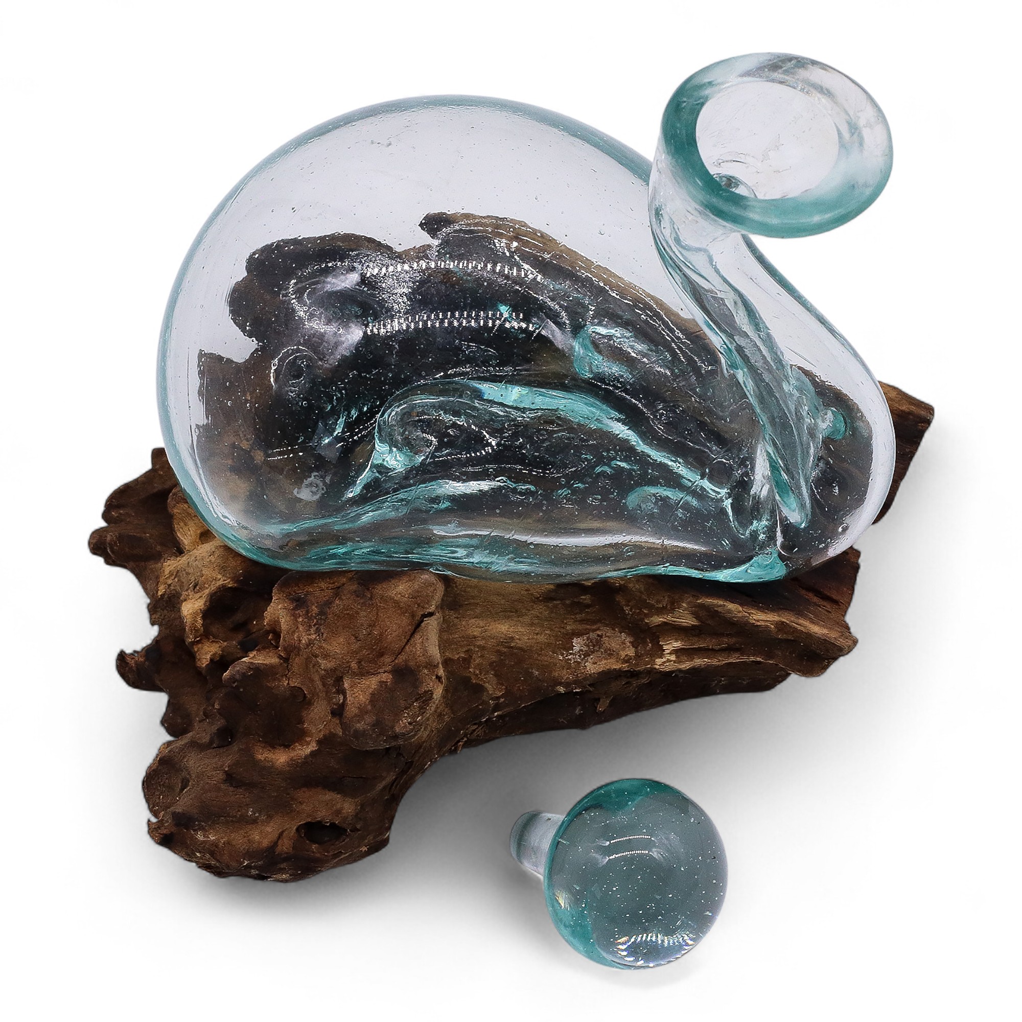 A Balin kézzel készített, olvasztott újrahasznosított üveget természetes fára öntik, amely hűlés közben biztonságos, organikus alapot képez. Beépített üvegdugóval kiegészítve praktikus és dekoratív is egyben.