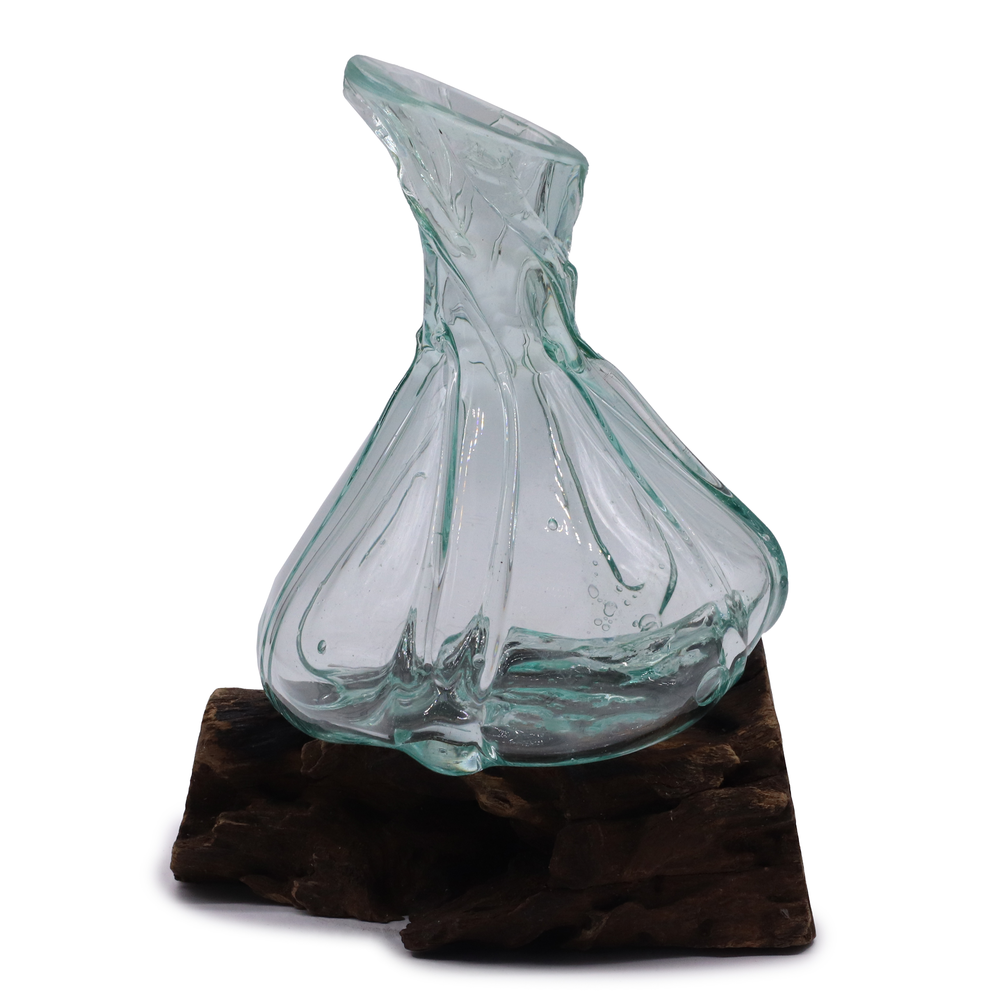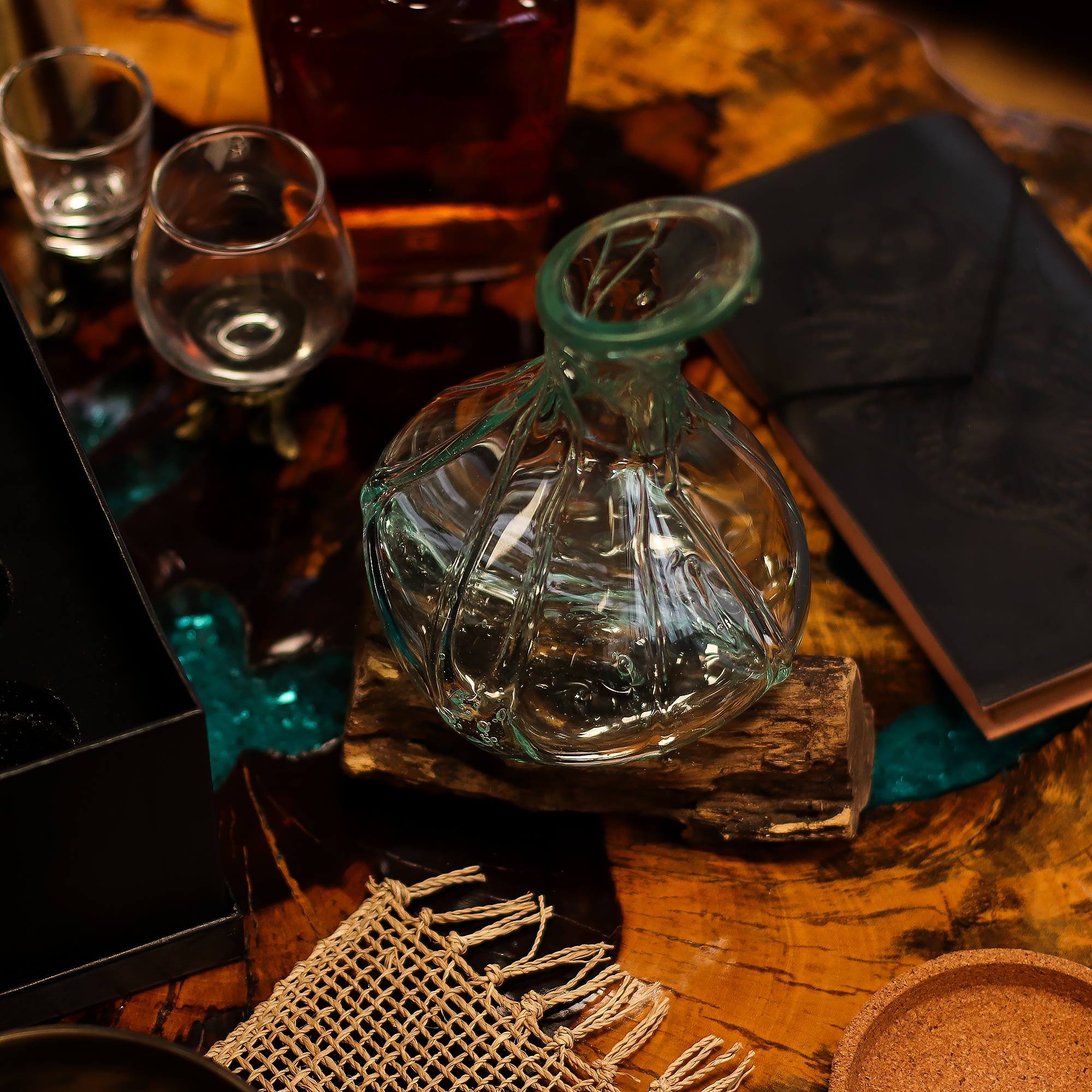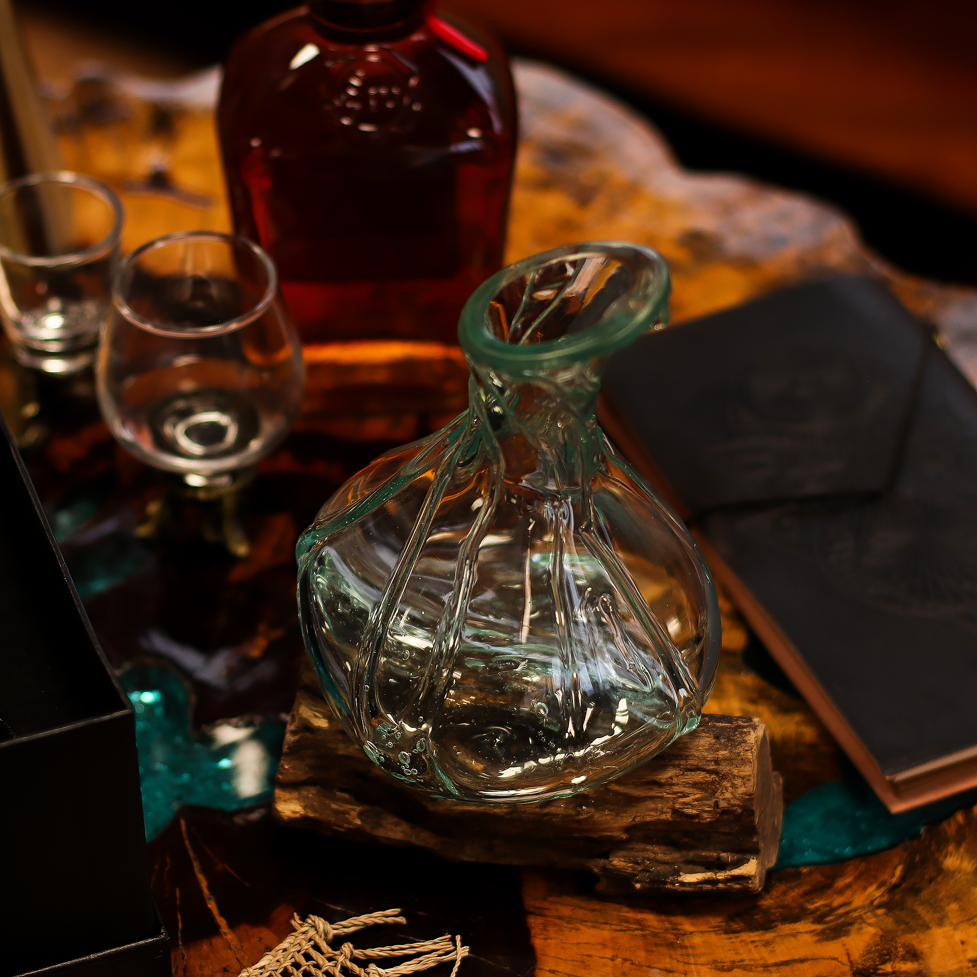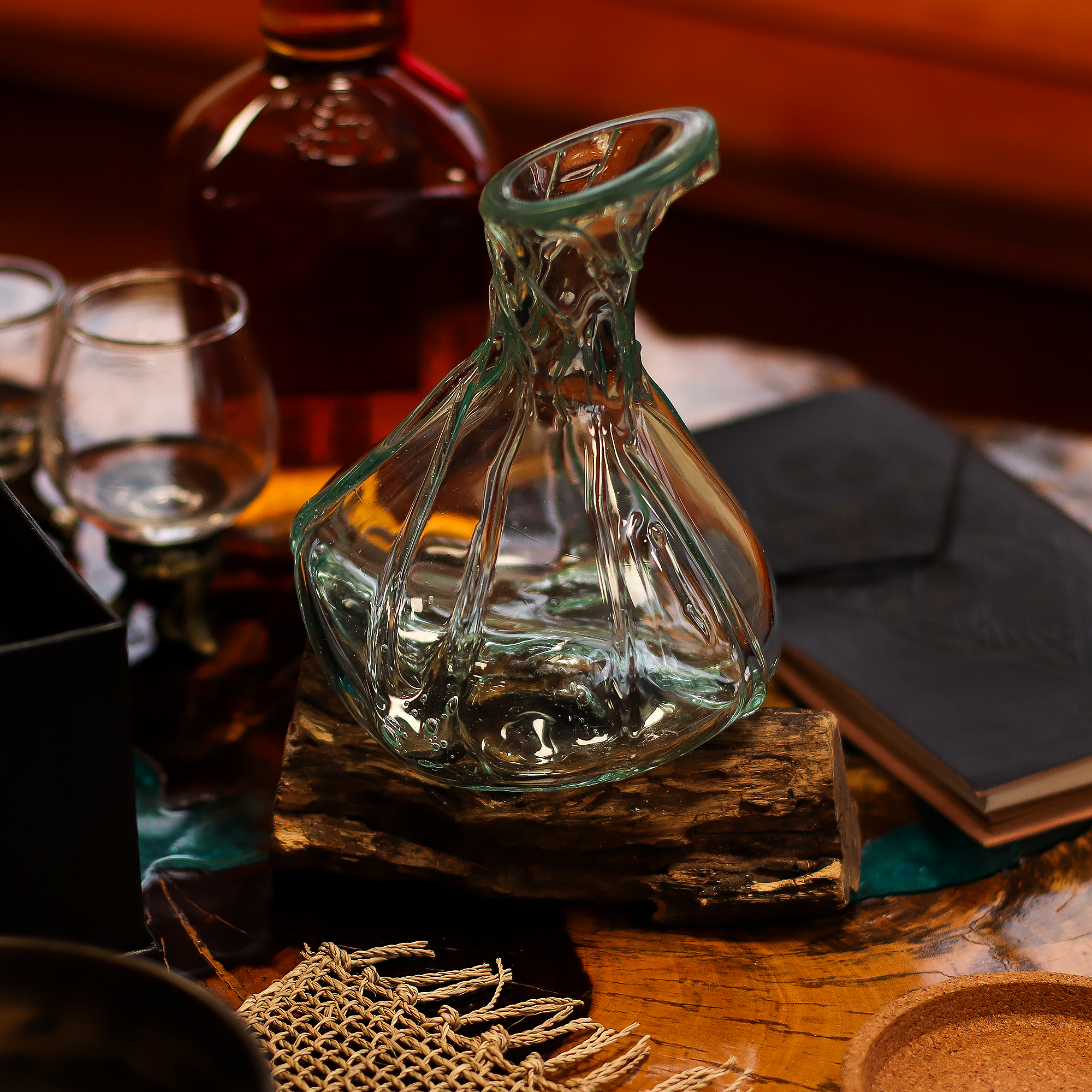 Minden boroskancsó kézzel készült újrahasznosított üvegből, és kecsesen nyugszik egy természetes fa talapzaton, amelynek formája az üveg hűlésével párhuzamosan tökéletes illeszkedést biztosít. Elegáns sziluettje és organikus textúrája ideálissá teszi funkcionális bor- vagy vízdekantálóként, vagy pusztán dekoratív tárgyként.