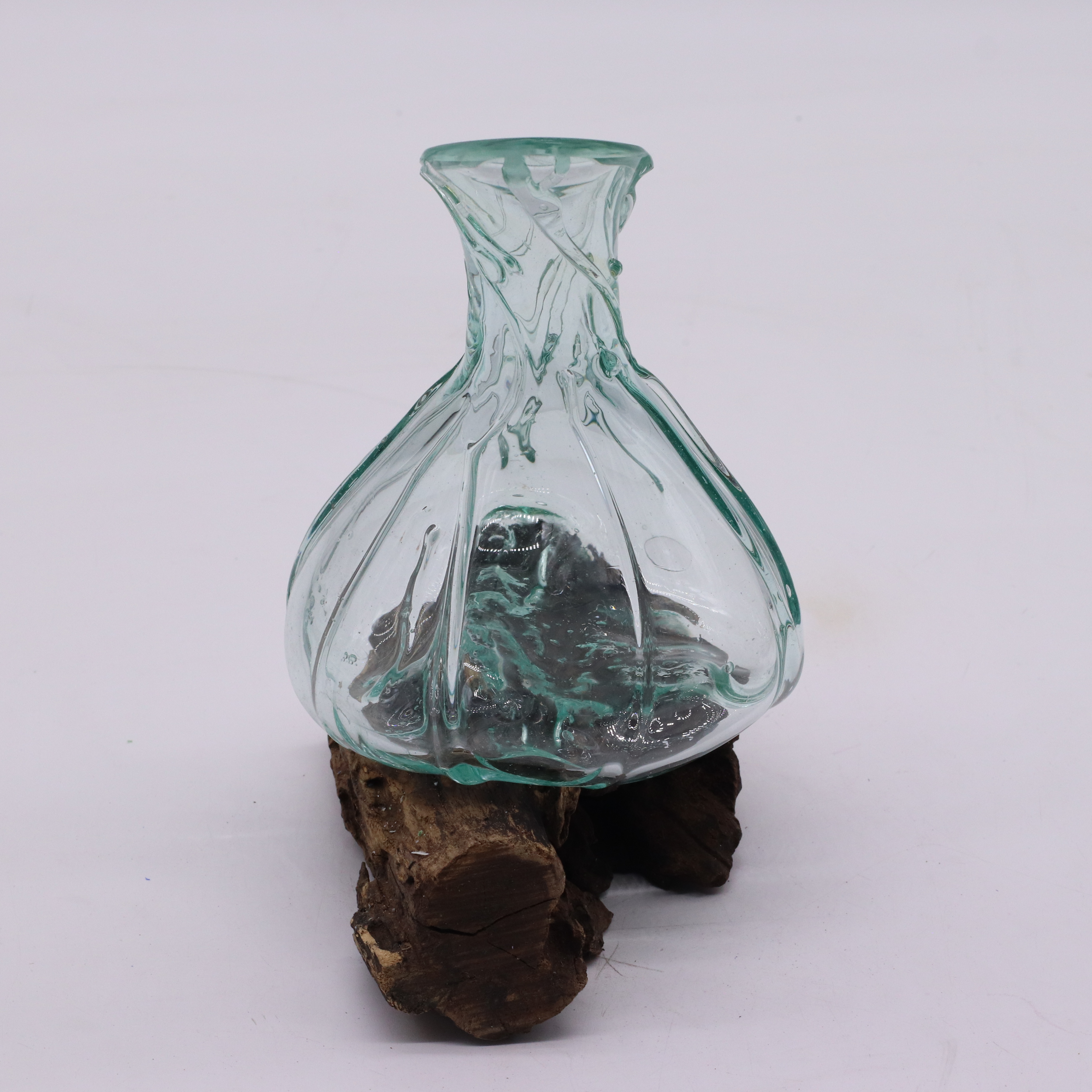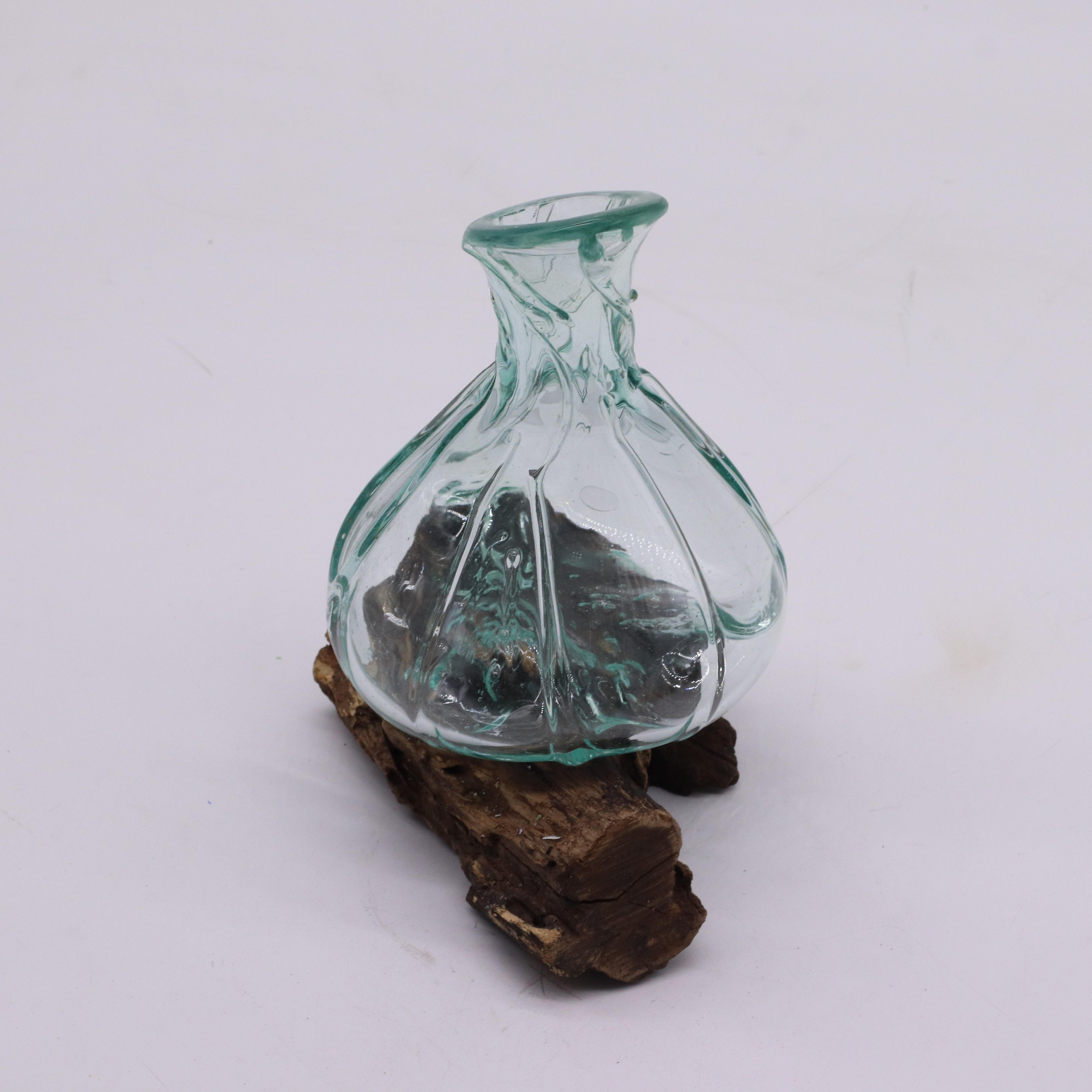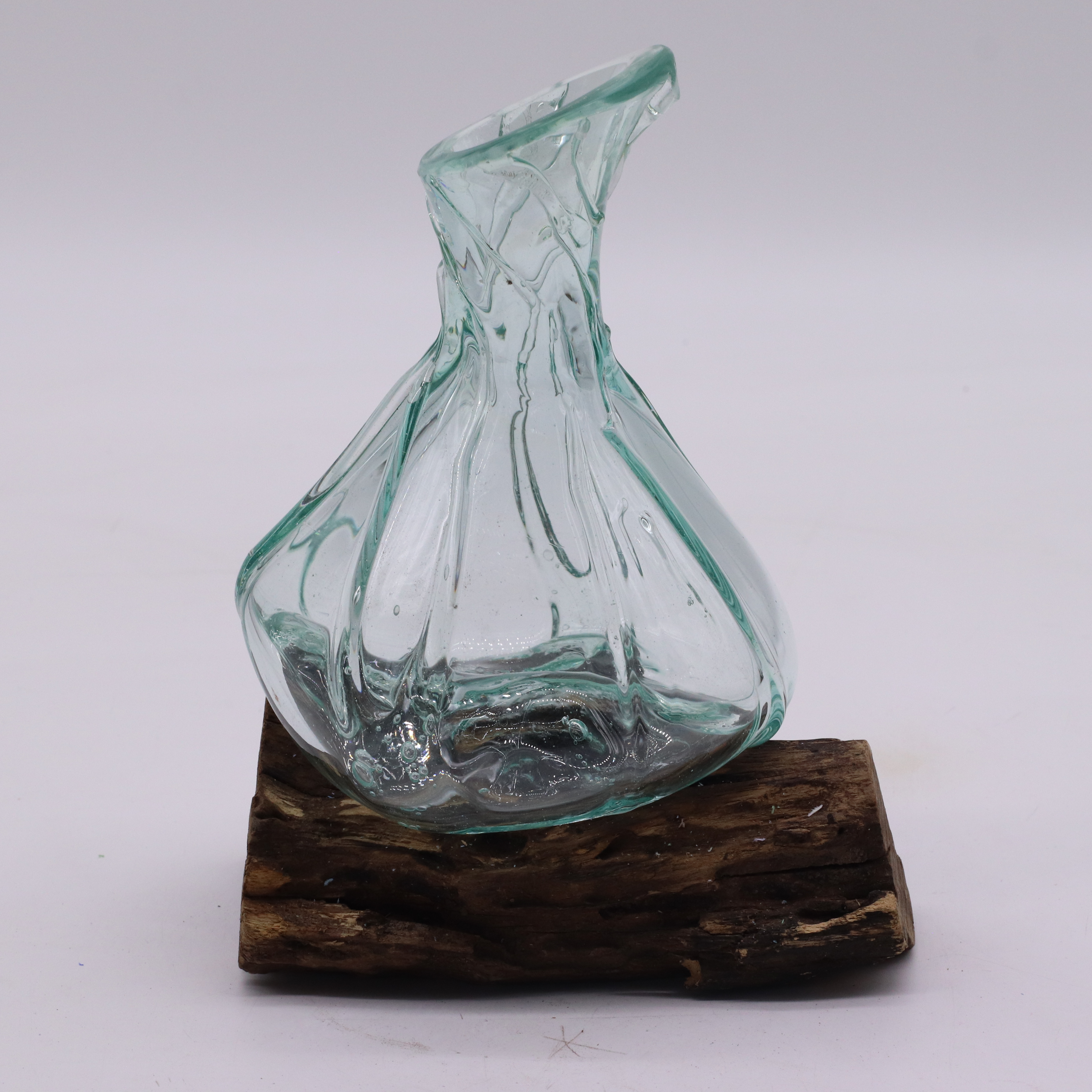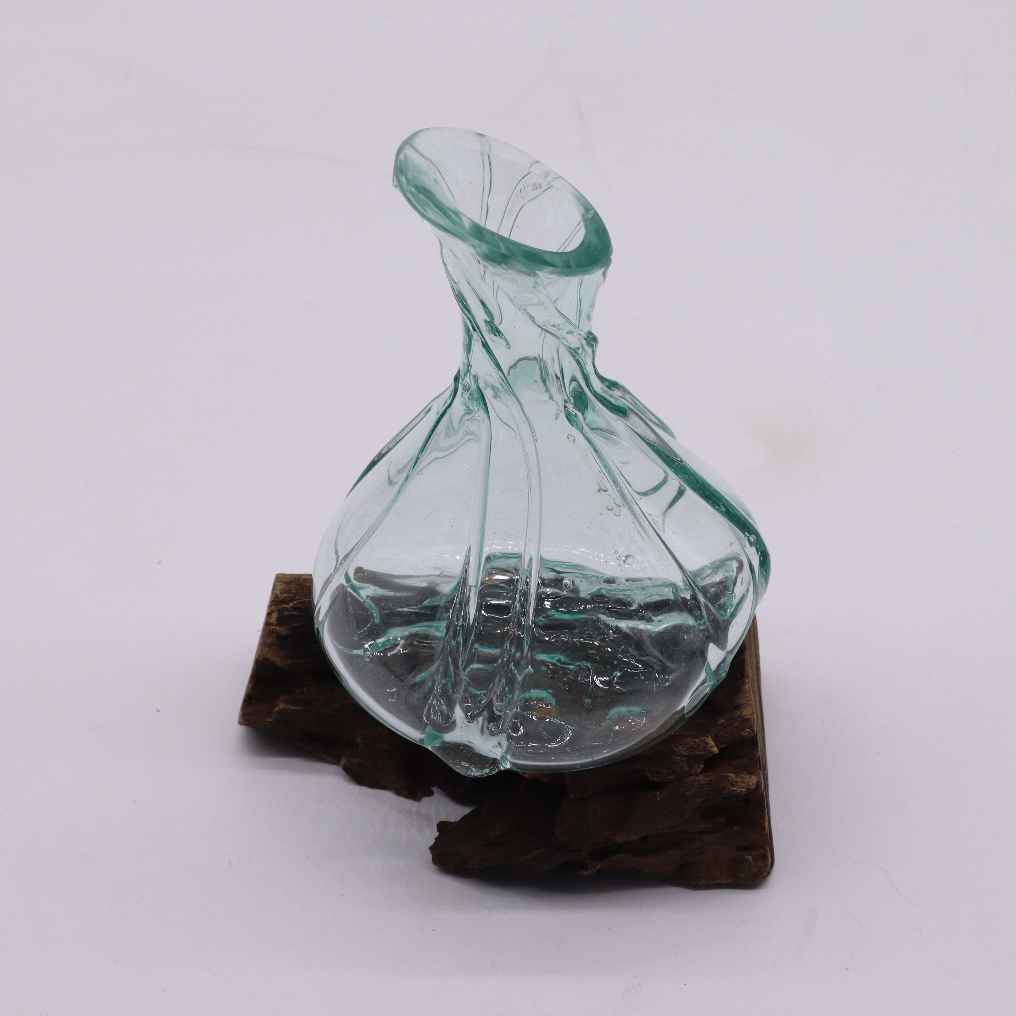 Minden boroskancsó kézzel készült újrahasznosított üvegből, és kecsesen nyugszik egy természetes fa talapzaton, amelynek formája az üveg hűlésével párhuzamosan tökéletes illeszkedést biztosít. Elegáns sziluettje és organikus textúrája ideálissá teszi funkcionális bor- vagy vízdekantálóként, vagy pusztán dekoratív tárgyként.