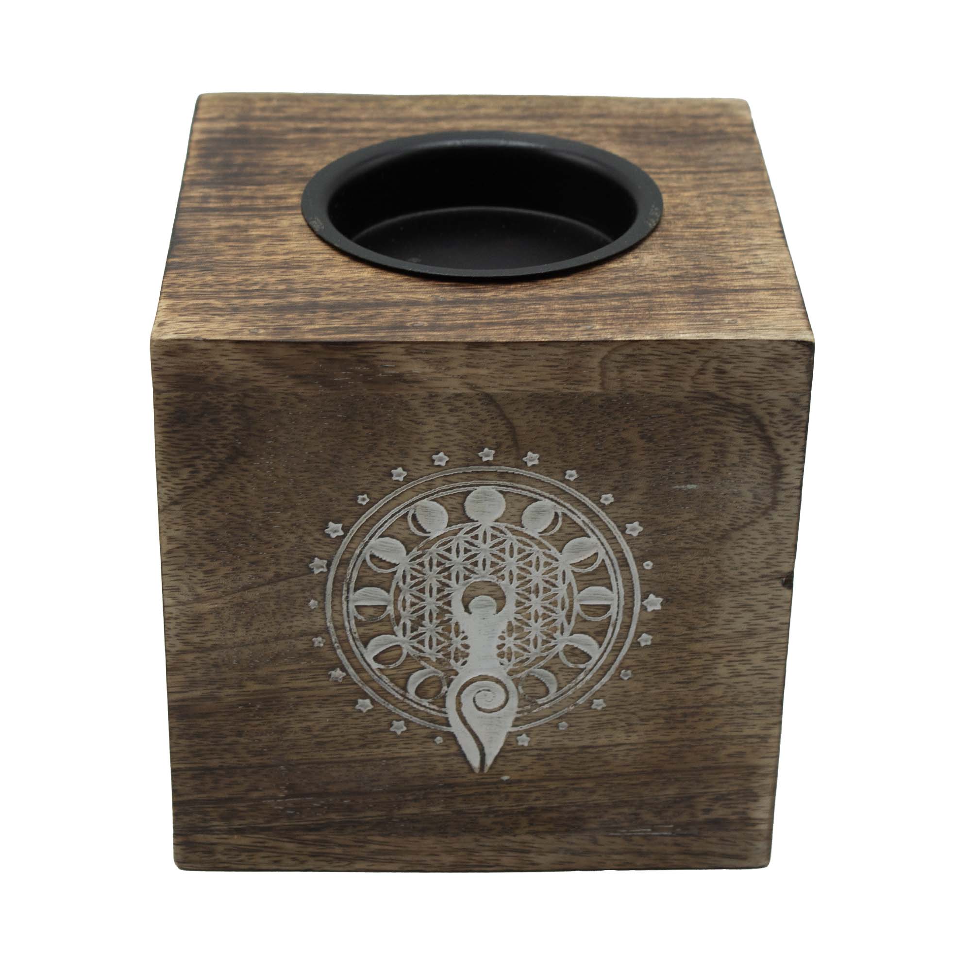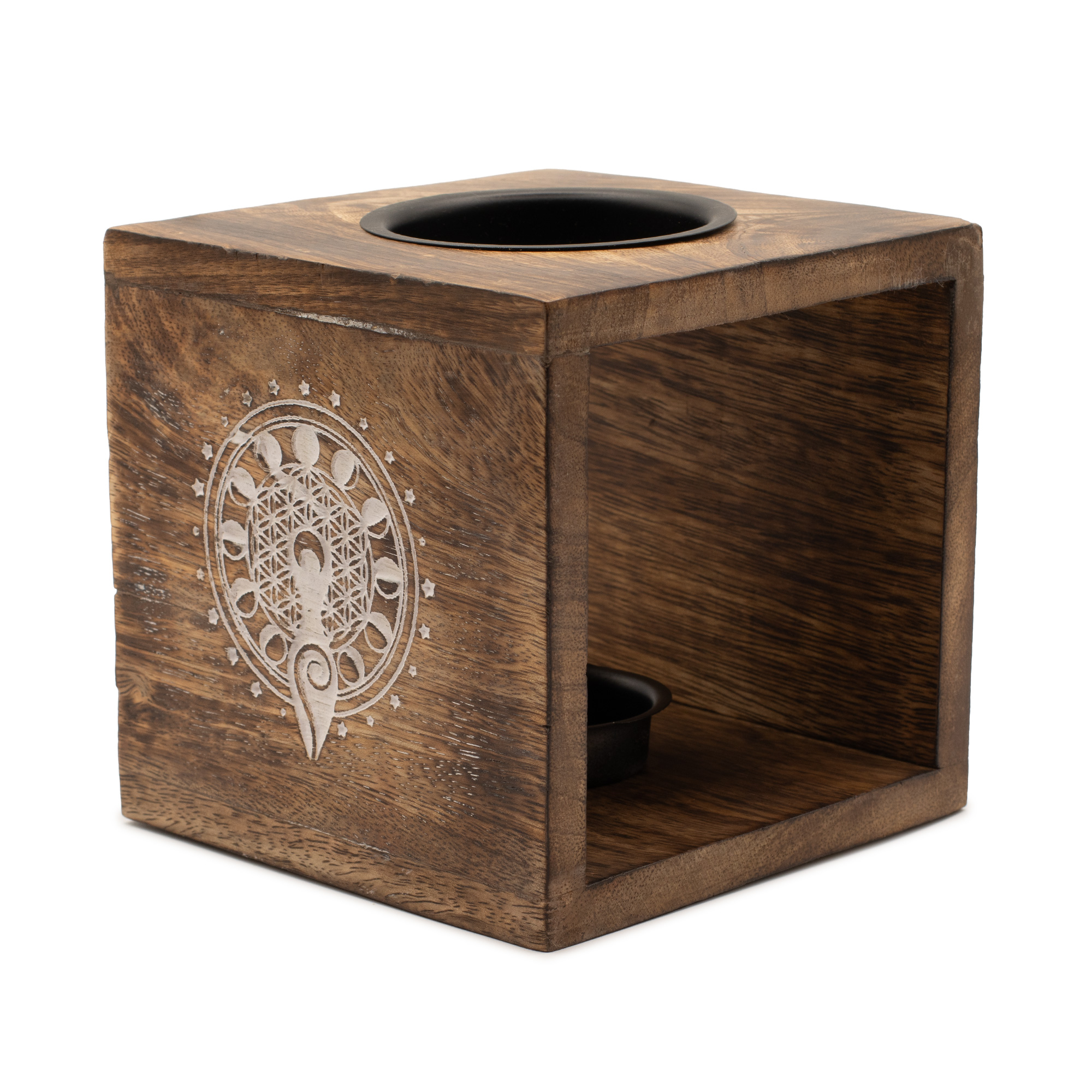 A Hold mintázat finoman gravírozva jelenik meg a lámpa oldalán, kellemes vizuális hangsúlyt adva anélkül, hogy túl domináns lenne. A mangófa természetes erezete minden darabot egyedivé tesz, így az aromalámpa saját karakterrel rendelkezik, és természetes módon illeszkedik az enteriőrbe.