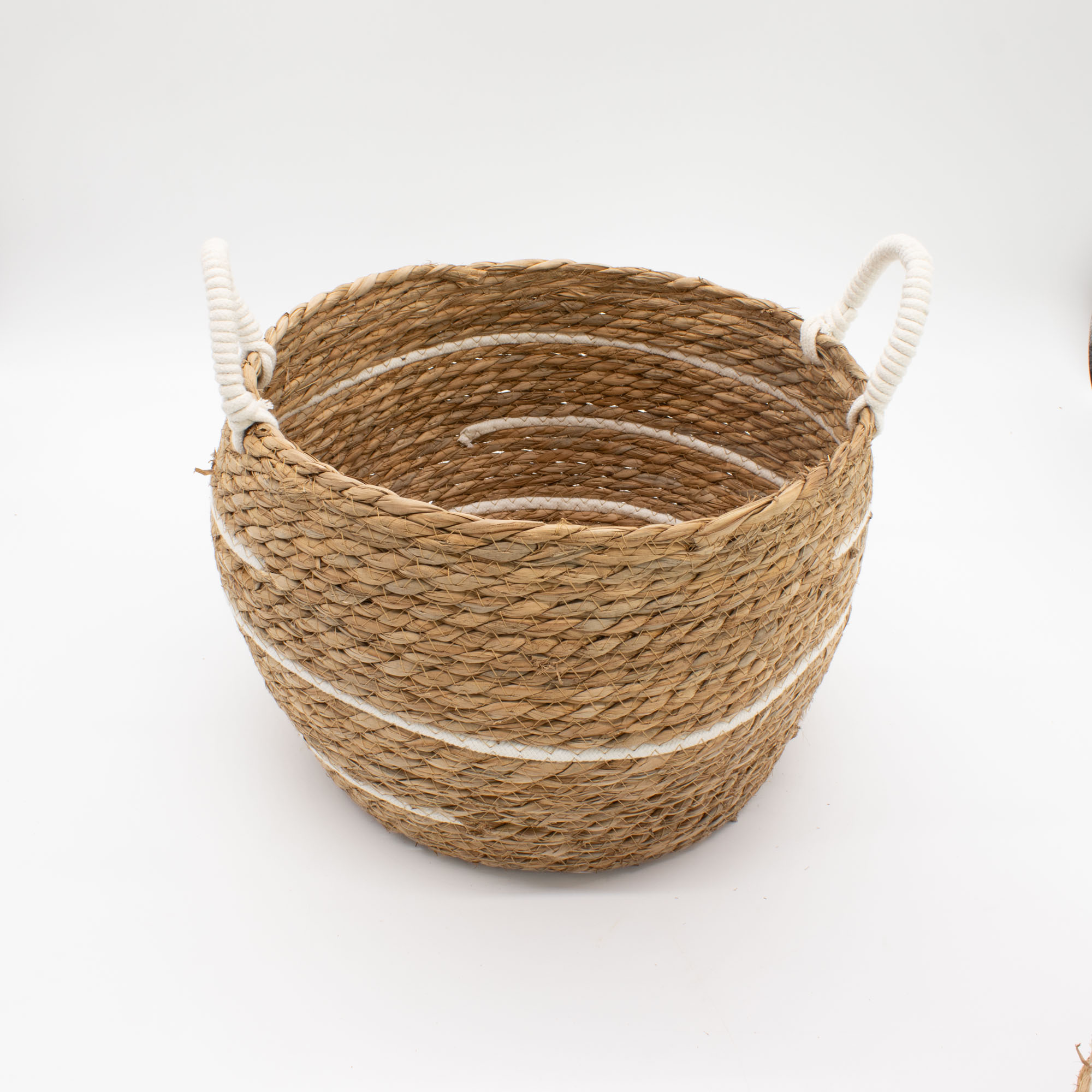 A nagy pamut és tengerifű kosarak – csíkos – 3 darabos szett természetes megjelenésű, kézzel font tárolókosarakat tartalmaz, amelyek jól illeszkednek lakberendezési, ajándék- és életmódüzletek kínálatába. A tengerifű alapanyag és a pamut csíkos részletek friss, könnyen kombinálható összhatást biztosítanak.