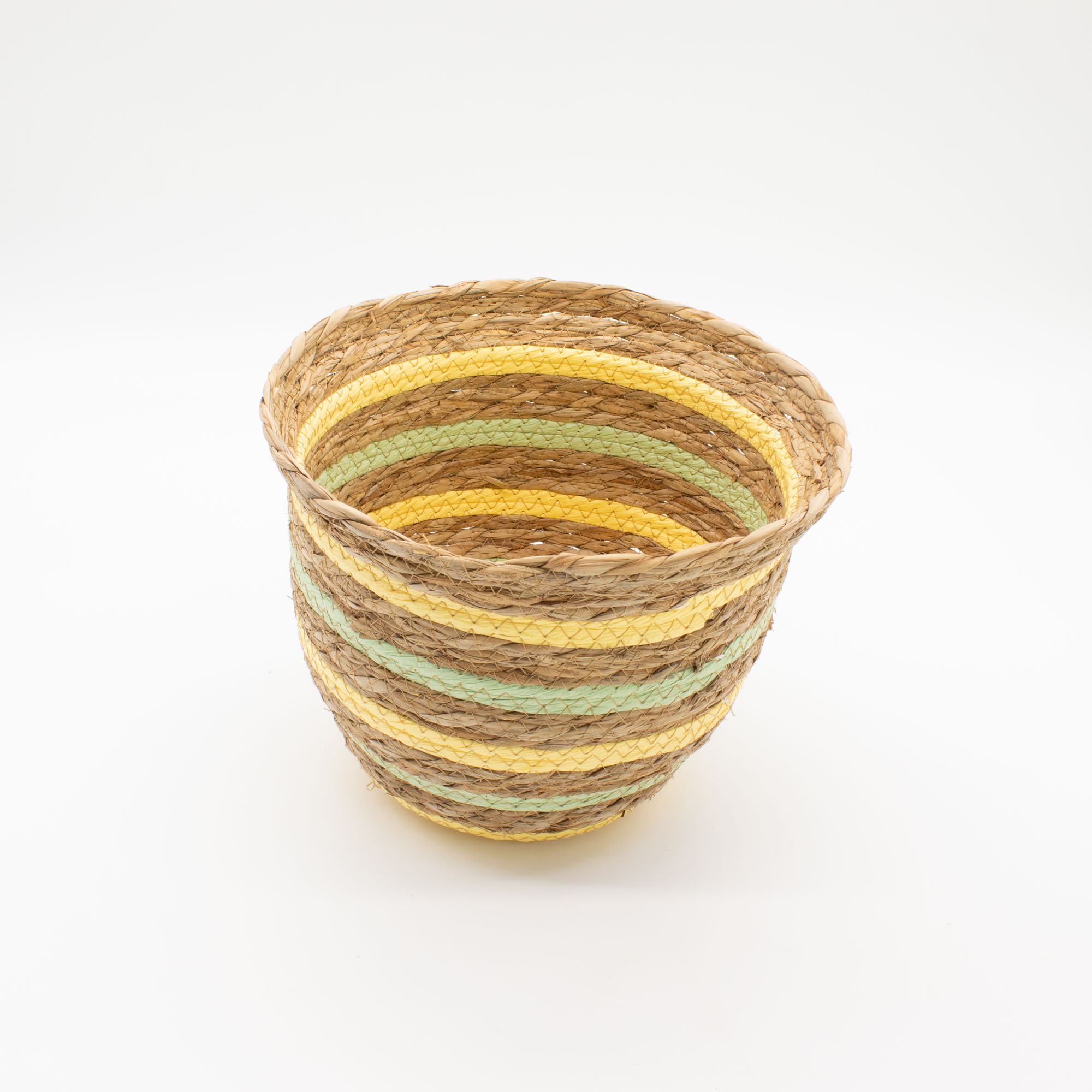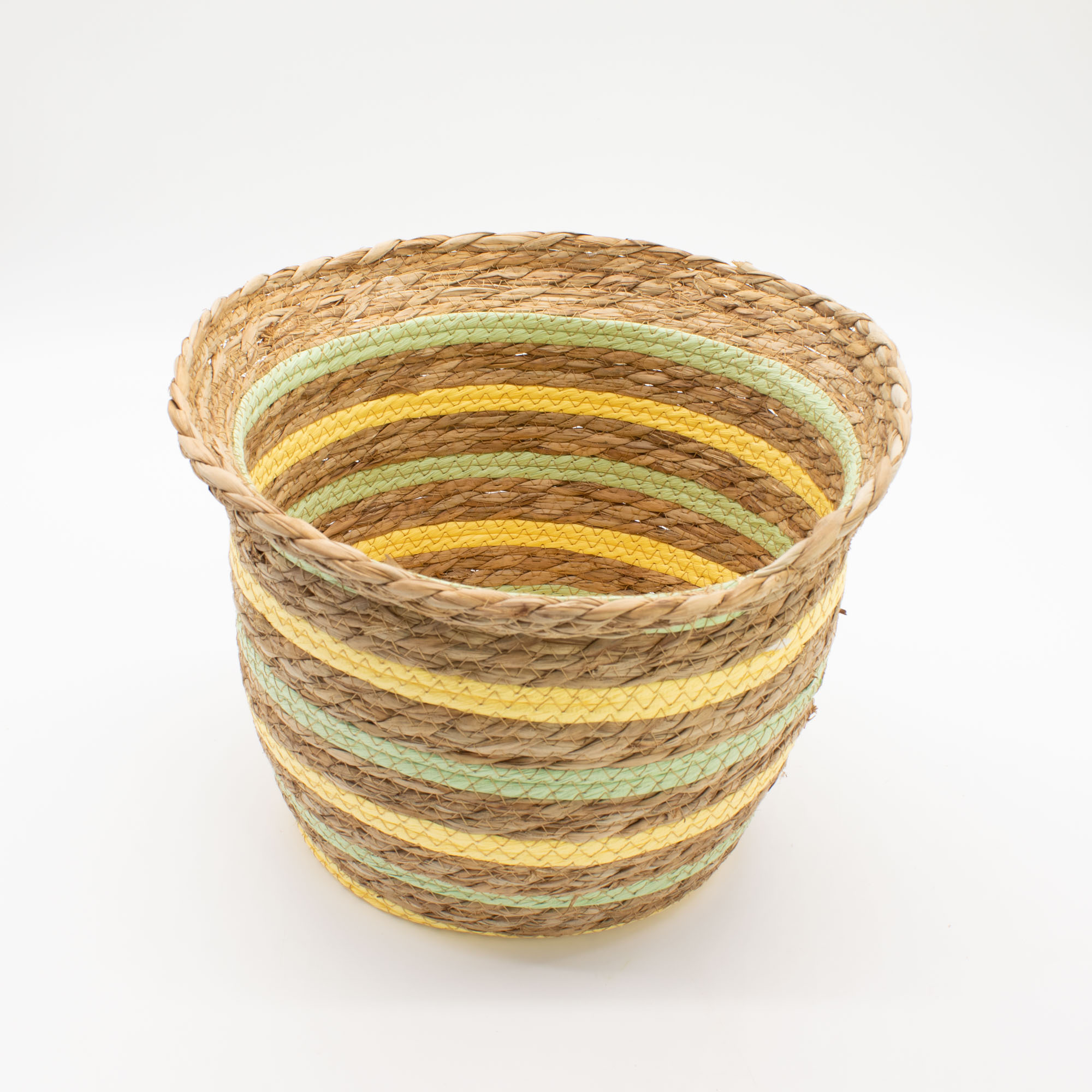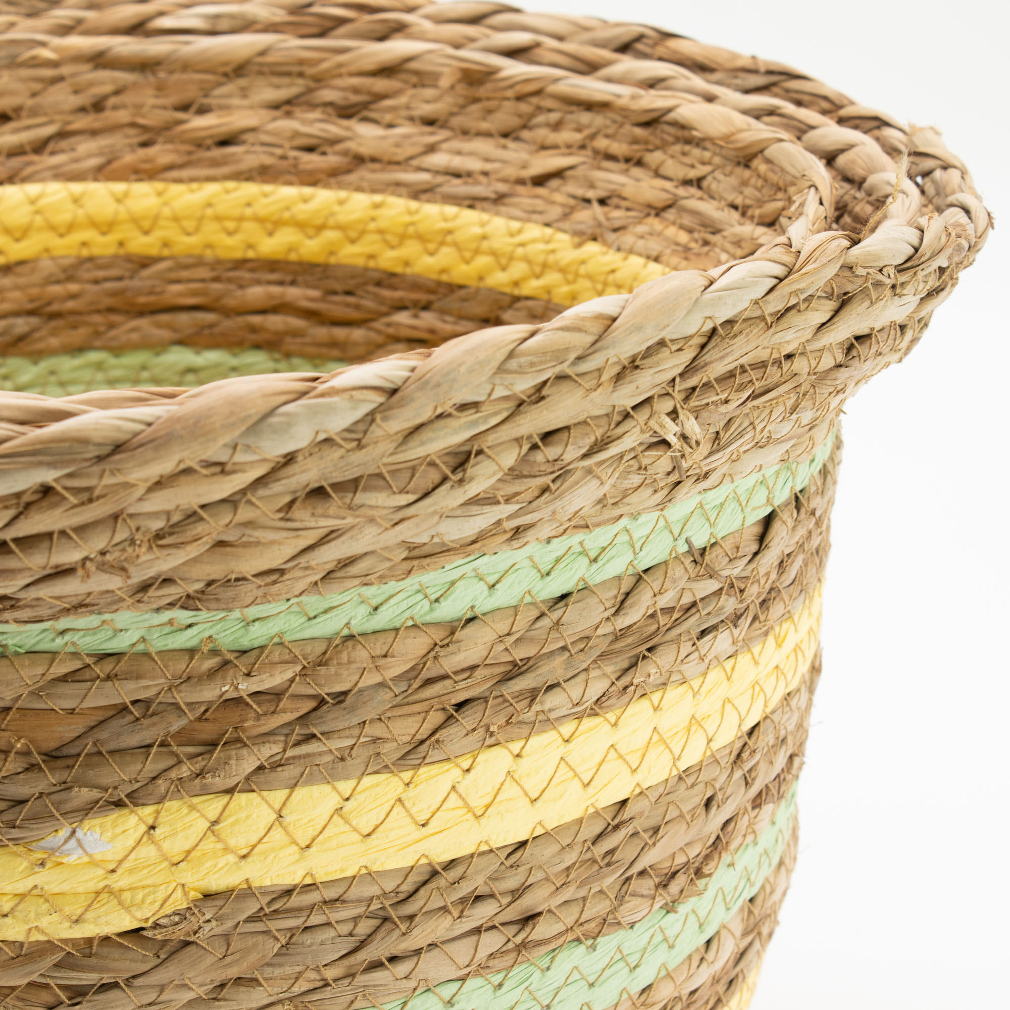 A tengerifű és szalma kosarak – sárga és zöld – 3 darabos szett természetes anyagokból készült, dekoratív tárolókosarakat tartalmaz, amelyek friss színkombinációjukkal vidám, mégis harmonikus megjelenést biztosítanak. A sárga és zöld csíkos részletek kellemes kontrasztot alkotnak a natúr alapfelülettel.