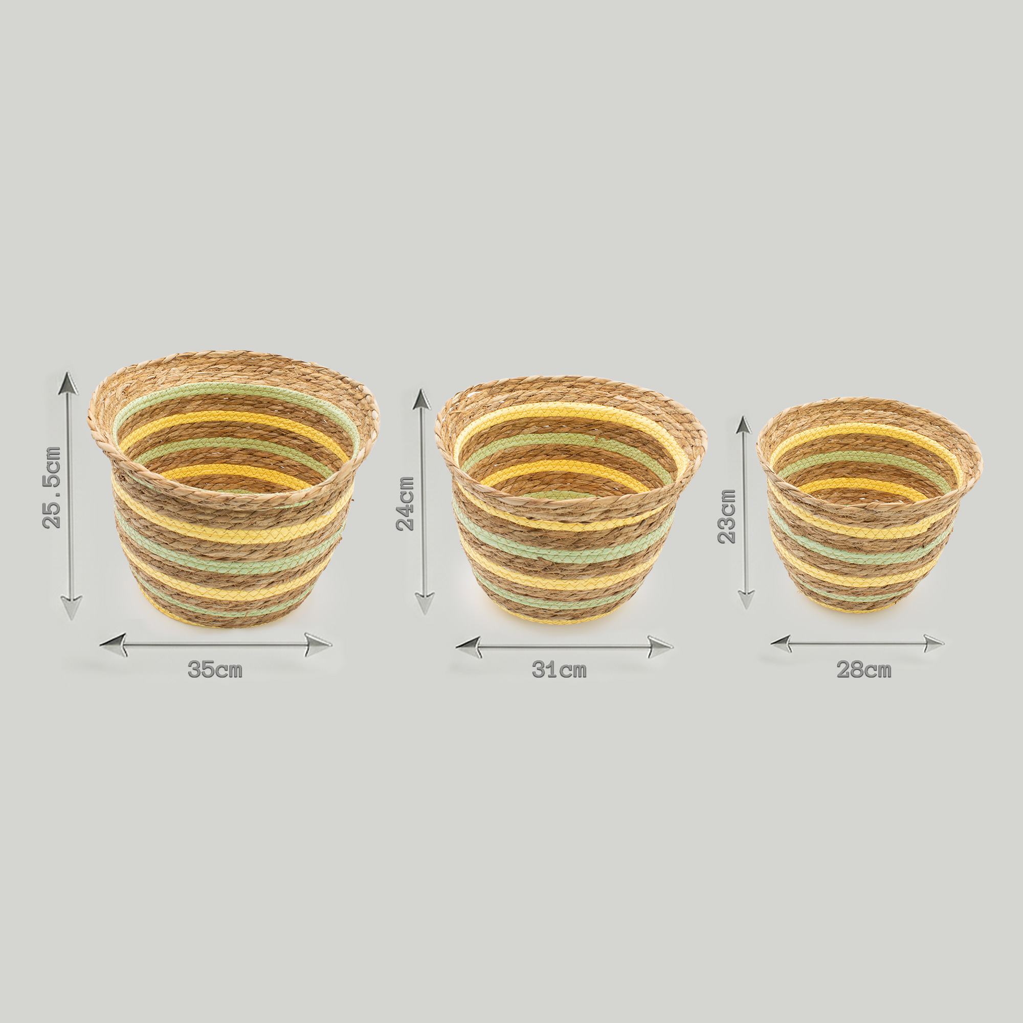 A tengerifű és szalma kosarak – sárga és zöld – 3 darabos szett ideális választás lakberendezési üzletek, ajándékboltok és szezonális displayek számára.