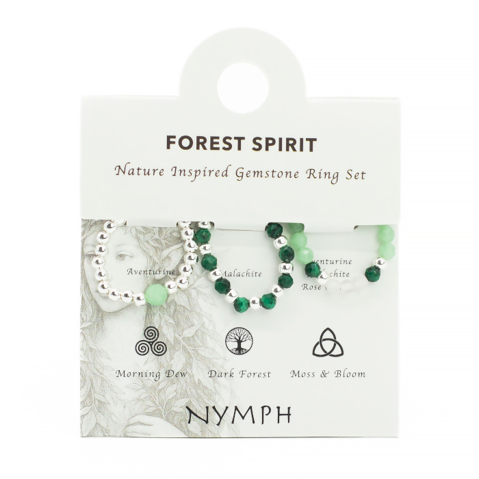 Az Erdő nimfa gyűrű együttes három, egymással harmonizáló gyűrűből álló szett, amely a természet zöld árnyalataiból és az erdei környezet nyugodt hangulatából merít inspirációt. A színösszeállítás friss, kiegyensúlyozott megjelenést biztosít, amely jól illeszkedik mind letisztult, mind természetközeli stílusokhoz.