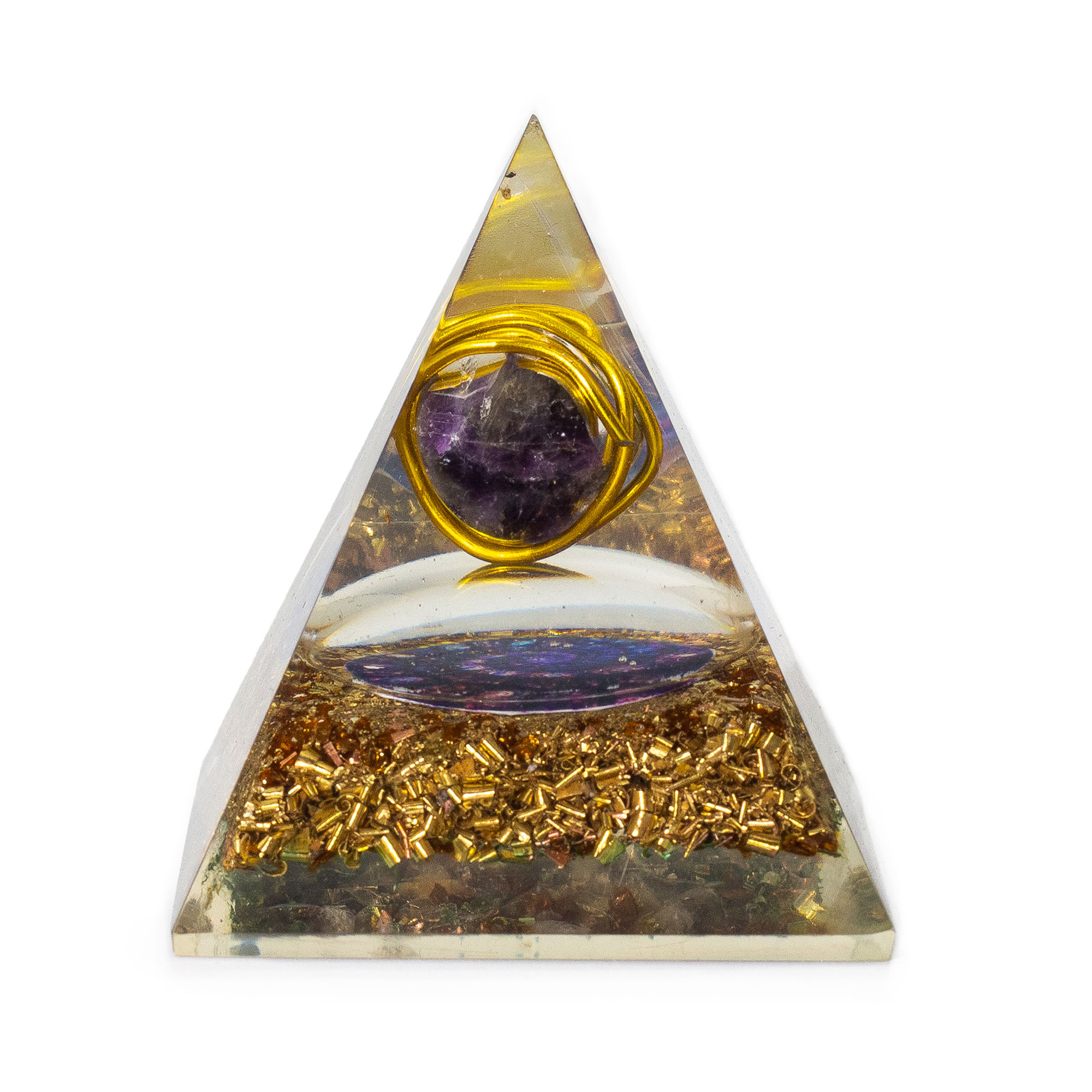 A közepes méretű orgonit piramis (7x6 cm) ametiszt és réz törmelék felhasználásával készült. A gyanta, fém és kristály kombinációjából álló kézműves tárgy harmonikus megjelenésű, és gyakran használják lakásdekorációként vagy meditációs környezetben.