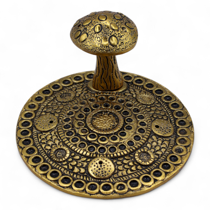 A réz színű gomba füstölőállvány dekoratív és funkcionális kiegészítőként szolgál különféle füstölőpálcikák használatához. A részletgazdag felületkialakítás és a stabil forma gondoskodik arról, hogy a füstölők biztonságosan elhelyezhetők legyenek.