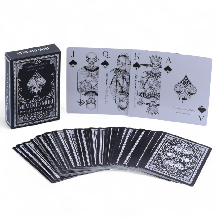 A Memento Mori játékkártyák egy különleges, művészien megtervezett kollekció, amely klasszikus eleganciát ötvöz modern grafikával. A fekete-fehér színvilág és a részletgazdag illusztrációk különleges megjelenést kölcsönöznek minden paklinak, így ideális választás mind a játék szerelmeseinek, mind a designkedvelőknek.