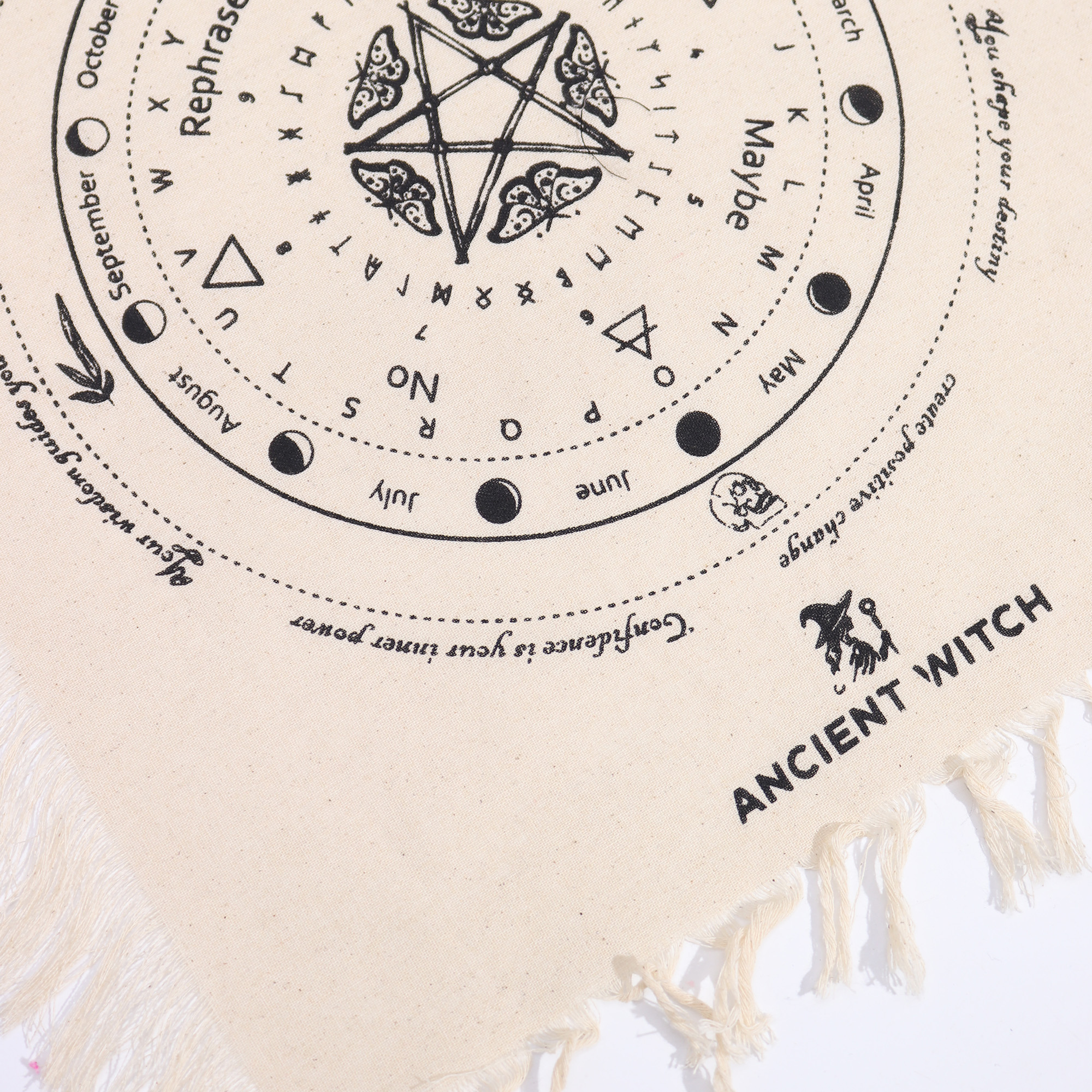 Dekoratív rojtos terítő részletgazdag molylepke motívummal és finom grafikai elemekkel. A natúr háttér és a fekete minta letisztult, kontrasztos megjelenést biztosít, amely könnyen illeszkedik különböző enteriőrökbe.