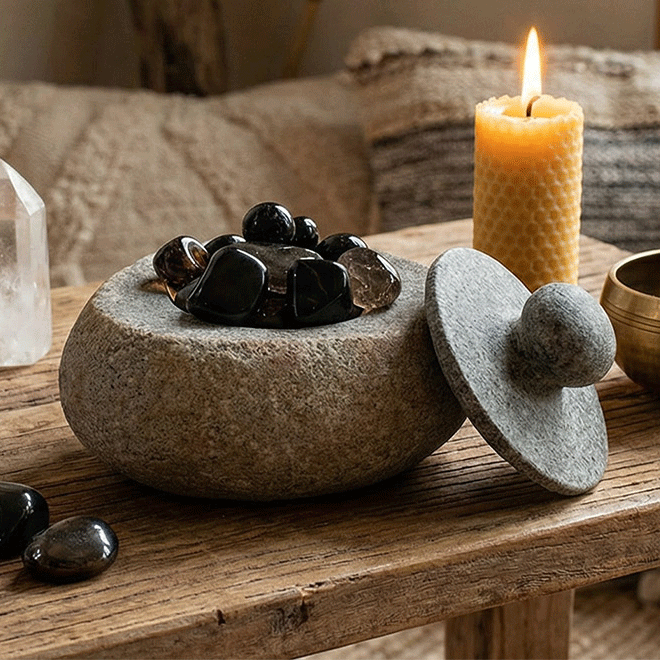 Az edény belső tere alkalmas különböző kövek, kristályok vagy egyéb apró tárgyak elhelyezésére, azonban a termék kizárólag az edényt tartalmazza. A képeken látható kövek és kristályok nem részei a terméknek, külön vásárolhatók meg. Ez lehetőséget ad arra, hogy a felhasználó saját preferenciái szerint válassza ki a belehelyezett elemeket.