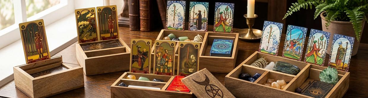 Ezek a tarot dobozok praktikus és esztétikus tárolási megoldást kínálnak tarot kártyák és kiegészítők számára. A kialakításuk átgondolt, több rekeszes belső elrendezéssel rendelkeznek, amely lehetővé teszi a kártyapaklik, kisebb tárgyak vagy egyéb eszközök rendezett elhelyezését. A beépített kártyatartó segítségével a lapok áttekinthetően bemutathatók használat közben.