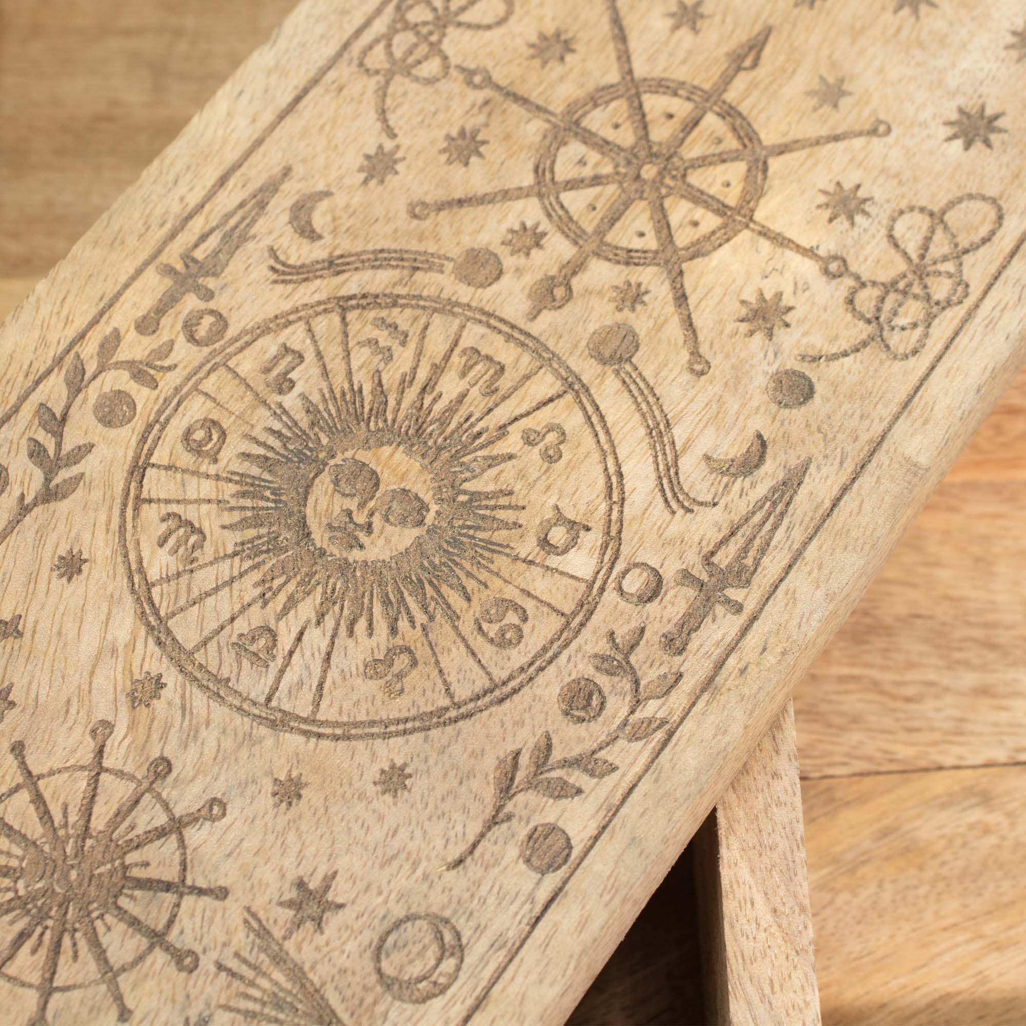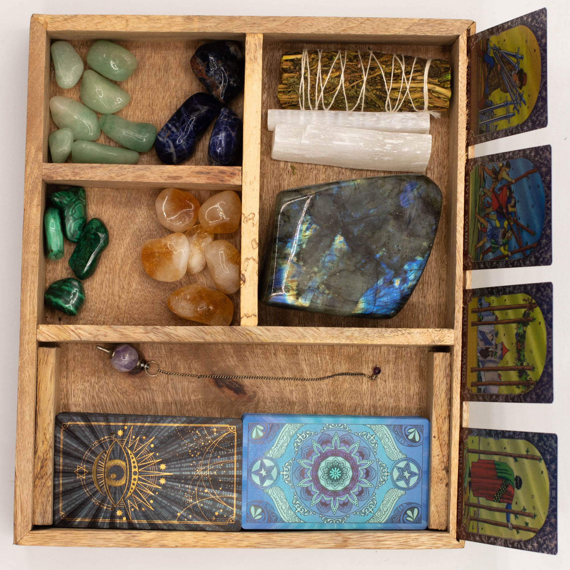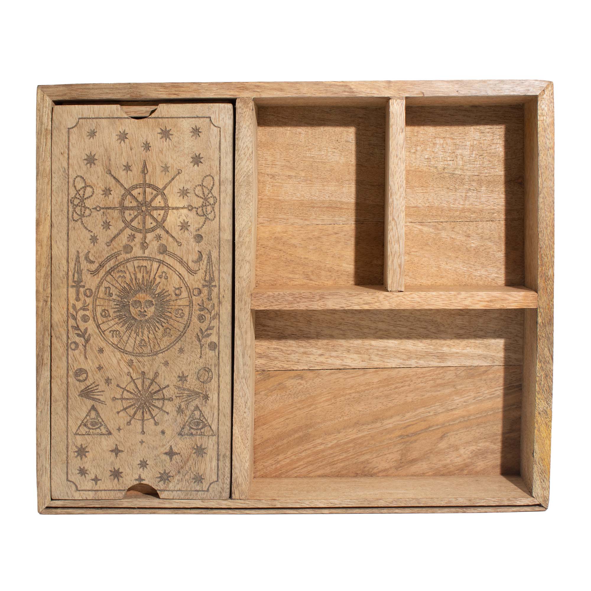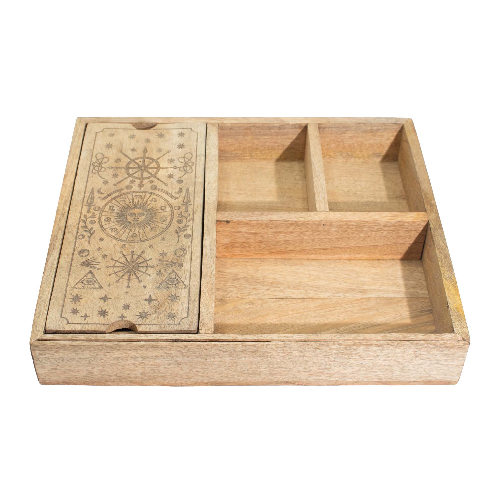 Ez a négy rekeszes tarot doboz átfogó és jól strukturált tárolási megoldást kínál tarot kártyák és különféle kiegészítők számára. A belső elrendezés több elkülönített részt biztosít, amelyek segítik a kártyapaklik, kisebb tárgyak és eszközök rendszerezett elhelyezését. A beépített kártyatartó lehetővé teszi egy kiválasztott lap esztétikus bemutatását.