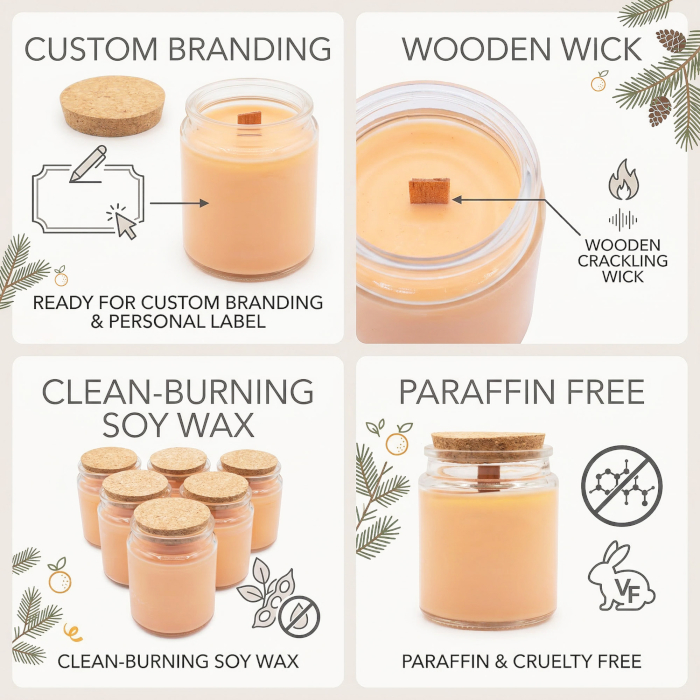 A fa kanóc égés közben finoman pattog, kellemes hangulatot teremtve, míg a citrusos illat élénk, frissítő jegyei tiszta és üde atmoszférát hoznak létre. Ez a dinamika különösen vonzó lehet ajándéküzletek, lakberendezési boltok és szezonális kínálatok számára.
