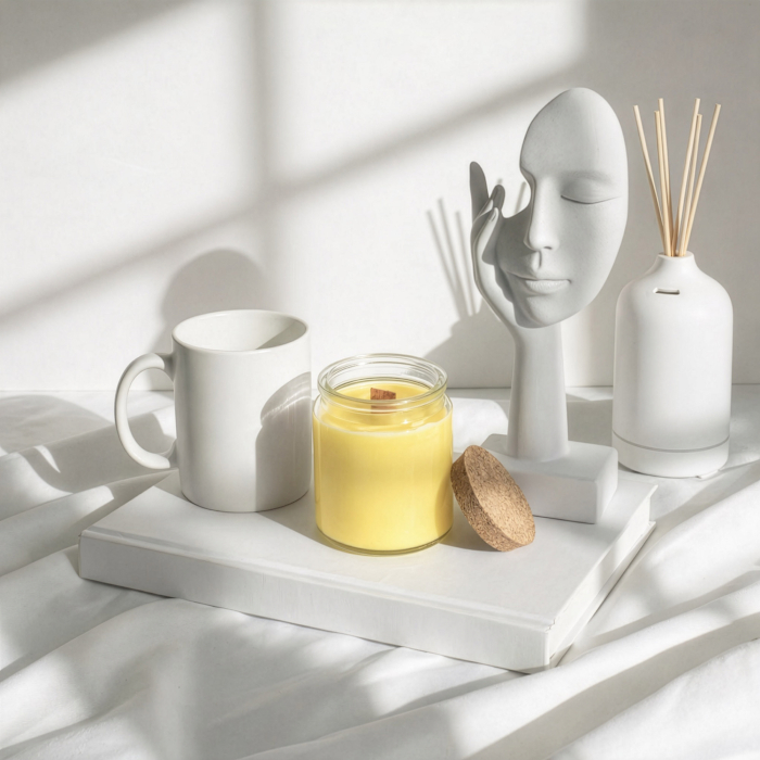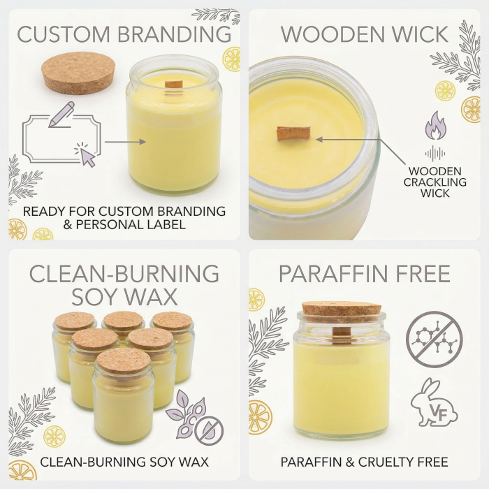 A „Cédrus és citrus” illatú, címke nélküli szójagyertyák kiegyensúlyozott, friss és fás karaktert hoznak a lakásillatosító kínálatba, ideális választást kínálva azoknak a kiskereskedőknek, akik saját márkás termékcsaládot szeretnének kialakítani. A letisztult üvegtégely és a természetes parafa fedő modern, mégis természetes megjelenést biztosít, amely könnyedén illeszthető különböző üzleti stílusokhoz.