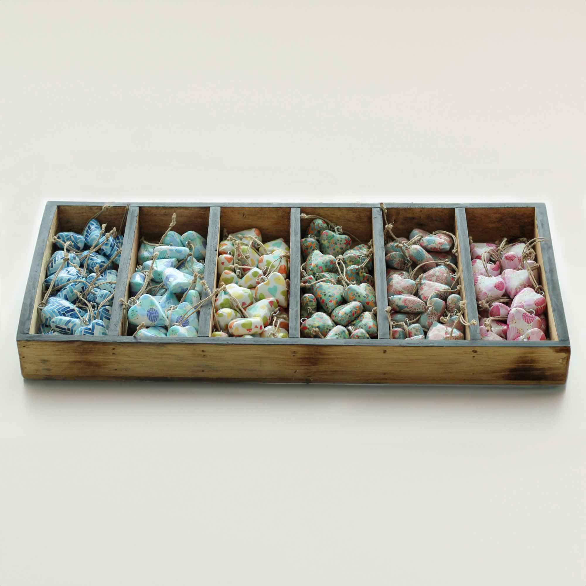 A kezdő együttes 144 darab kis dekorációs fa szívet tartalmaz, és egy ingyenes, 6 rekeszes kijelzőtálcát: